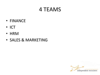 Independent Recruiters is both a generalist and specialist recruiting firm. They recruit for a variety of fields and have consultants specialized in specific areas of expertise. They recruit professionals and managers with bachelor's degrees or higher, for positions in Europe and worldwide, paying between €40,000 to €150,000 annually. Fields they recruit for include finance, ICT, HR, sales/marketing, and consulting.