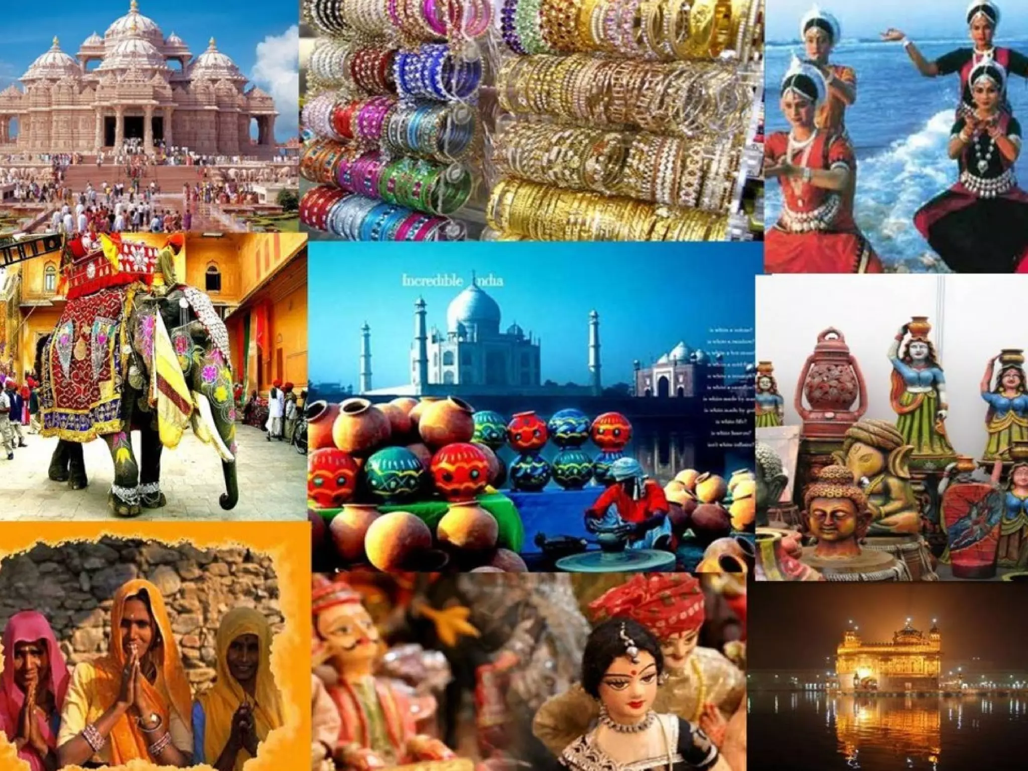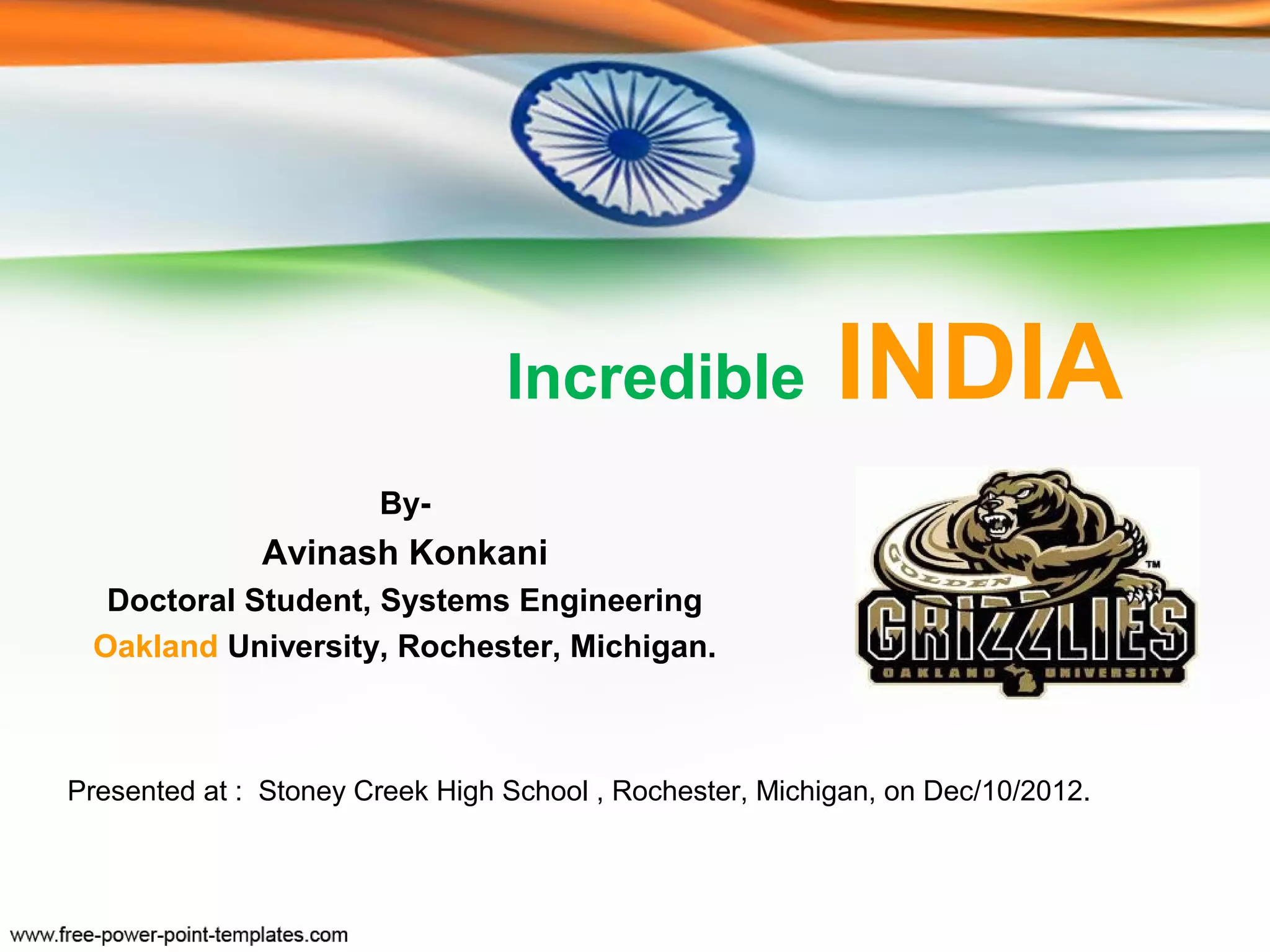The document provides an overview of India, discussing its geography, population, national symbols, and major festivals. It highlights key facts such as India's status as the 7th largest country and the 2nd most populated, along with cultural aspects like religions and languages. Additionally, it mentions the significance of festivals like Diwali and Holi, and features locations and resources for experiencing Indian culture, particularly in the Detroit area.