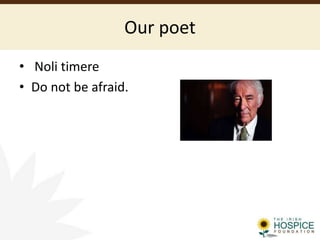 This document discusses death education and society's avoidance and denial of death. It notes that death anxiety is hardwired in humans and cultures provide meaning and defense against this reality. While death was once a community experience, it is now more private and prolonged. The aims of death education are personal development and responsible social participation. It should educate those associated with dying, death and bereavement. Death education encompasses public empowerment through knowledge, professional skills development, and personal learning including self-awareness. Models may include cognitive, experiential and arts-based approaches.