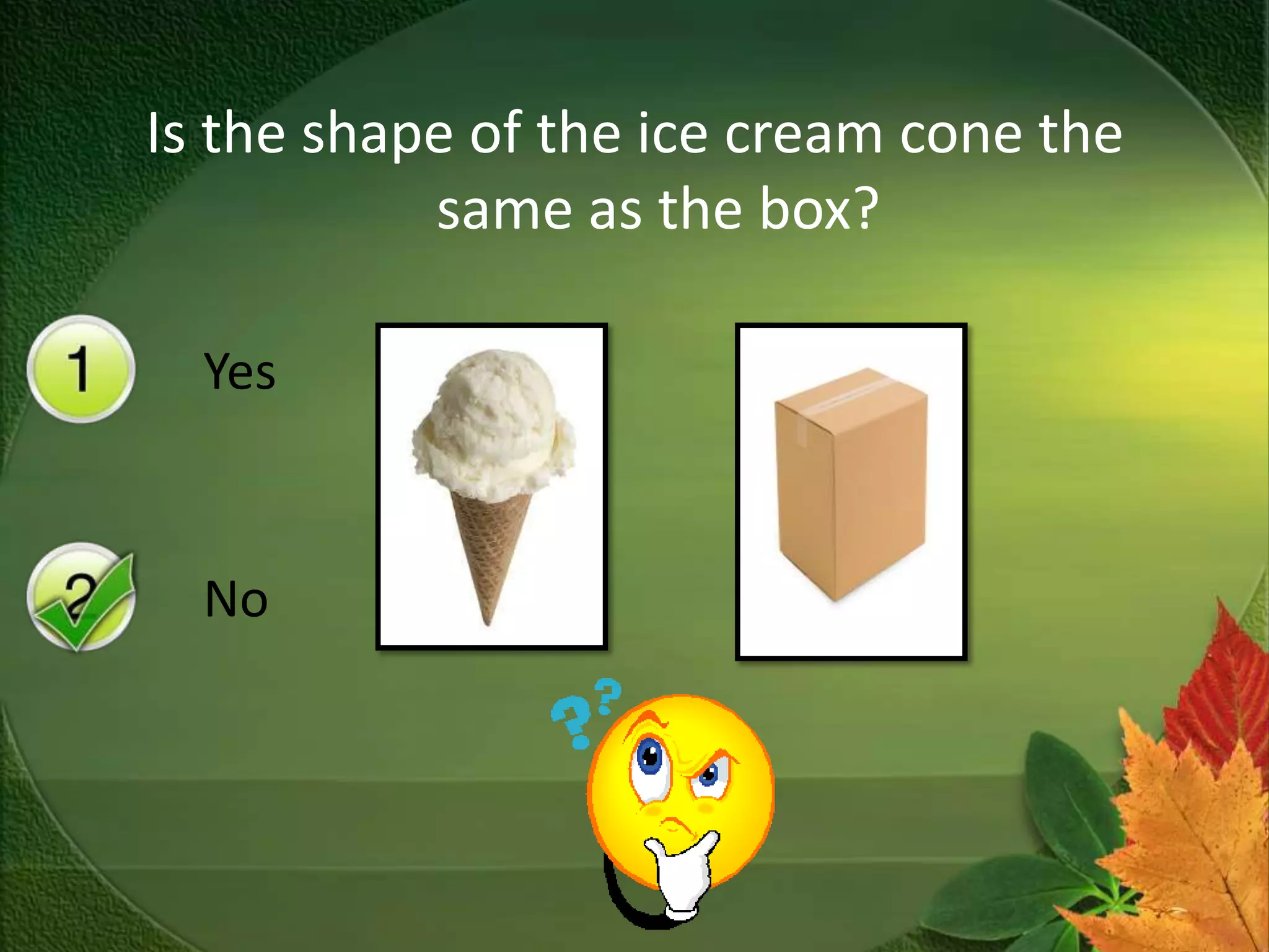 The document asks if the shape of an ice cream cone is the same as the box, with a yes or no response. It then provides an example of a verb in Tagalog, with bumili ako ng kendi sa ale as the example given. Finally, it asks which of the following does not belong to the group, but provides no options to choose from.