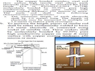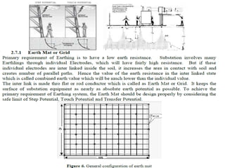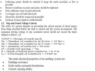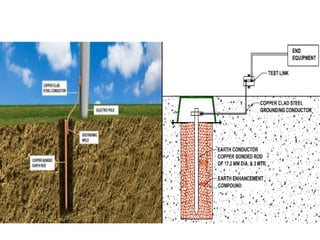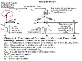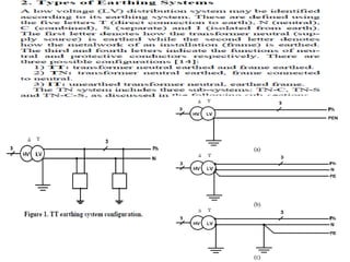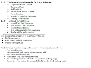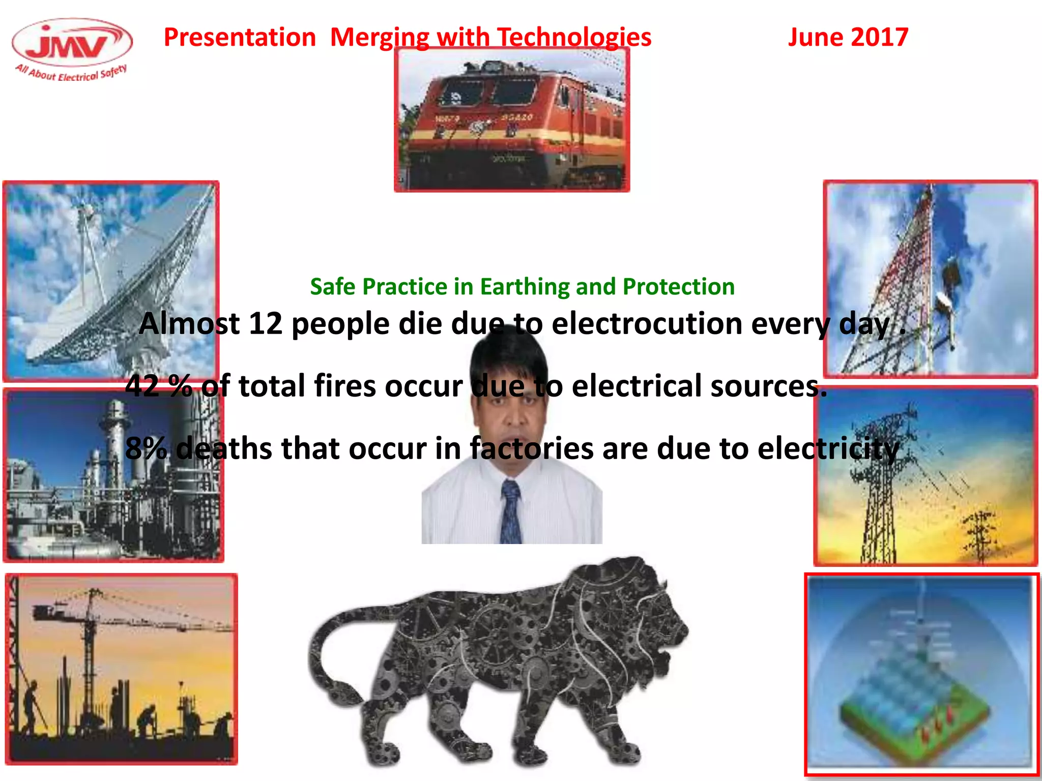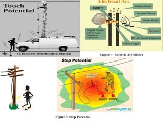This document discusses safety practices regarding earthing and protection in electrical installations. It notes that approximately 12 people die every day and 42% of total fires occur due to electrical sources in India. Proper earthing and use of protective devices is important for safety. Factors like lack of maintenance, supervision, knowledge and negligence can lead to accidents. The document discusses causes of arcing faults and lightning accidents. It emphasizes the importance of proper earthing for safety, maintenance of voltage levels, and operation of protection devices. Earthing reduces touch and step voltages to safe levels.