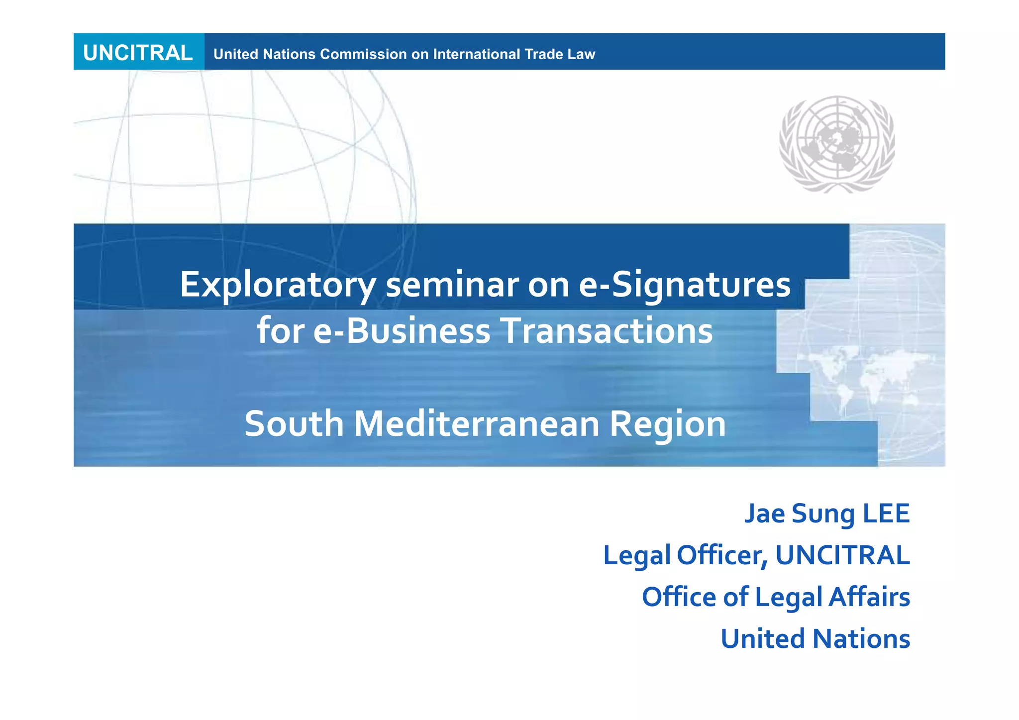 The document discusses UNCITRAL (United Nations Commission on International Trade Law), an intergovernmental organization within the UN that works to harmonize and modernize rules on international business. It provides information on UNCITRAL's composition, organization, working groups, and role in developing model laws and conventions related to electronic commerce, including the UNCITRAL Model Law on Electronic Commerce, Model Law on Electronic Signatures, and the UN Convention on Electronic Communications in International Contracts. The document also summarizes UNCITRAL's current work on electronic transferable records and identity management.