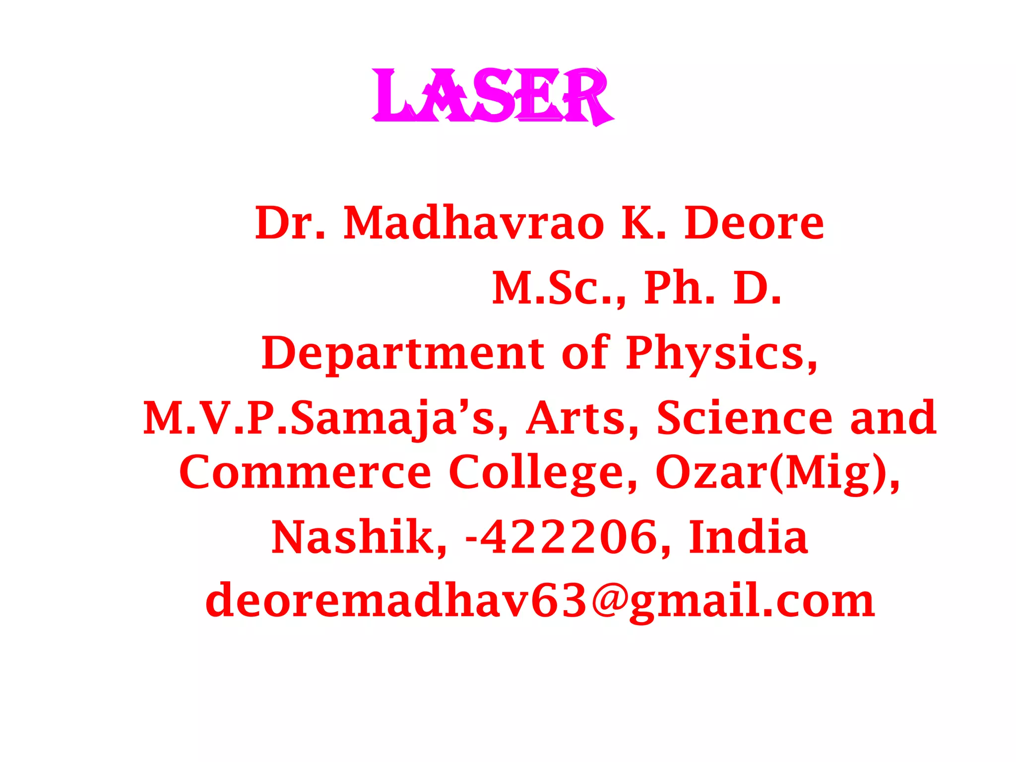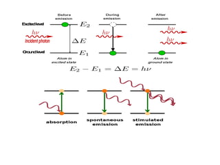 The document provides a comprehensive overview of lasers, detailing their historical development, fundamental principles of operation, and key characteristics compared to ordinary light. It describes the process of stimulated emission, which is essential for laser functionality, and explores the interaction of electromagnetic radiation with matter. Additionally, the document discusses concepts like population inversion, absorption, and spontaneous emission, significant for understanding laser technology.