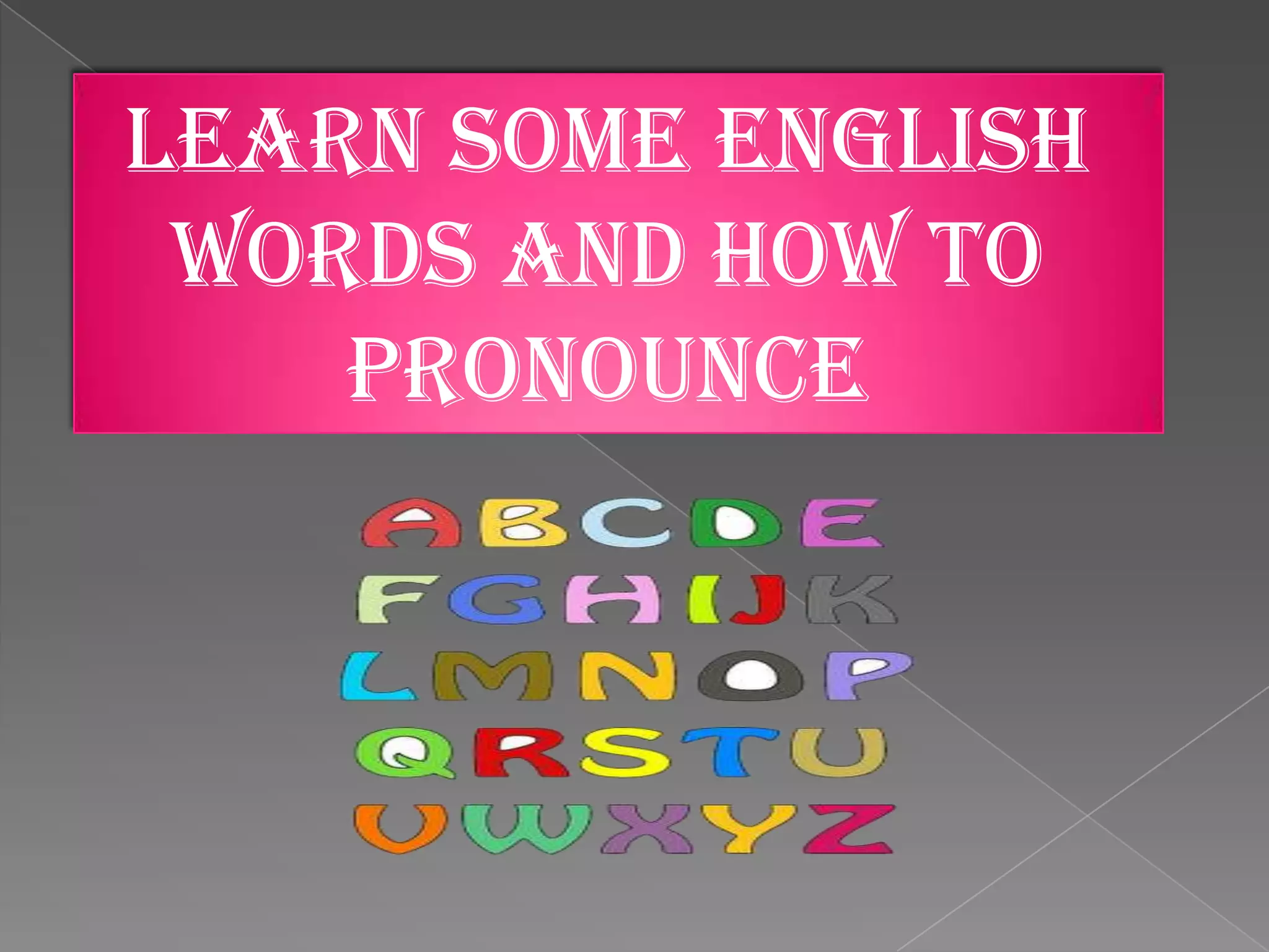 This document lists common English words from A to Z to learn how to pronounce. It includes nouns like apple, bread, car, desk, elephant, fort, giraffe, hand, ice, jam, kangaroo, leaf, mountain, nest, octopus, panda, queen, rain, star, television, umbrella, vegetables, whale, xylophone, yellow, and zebra to help someone learn basic English pronunciation.