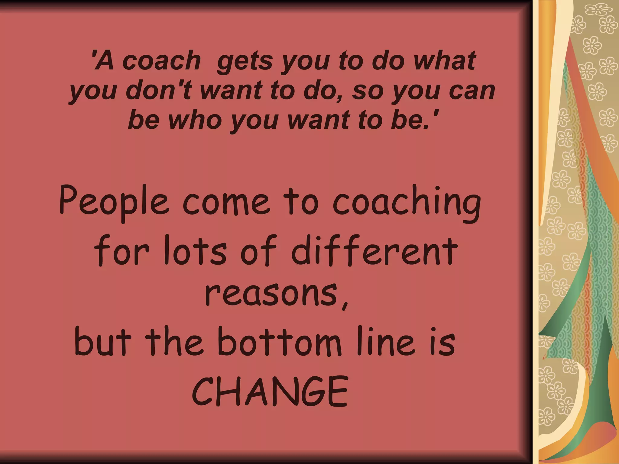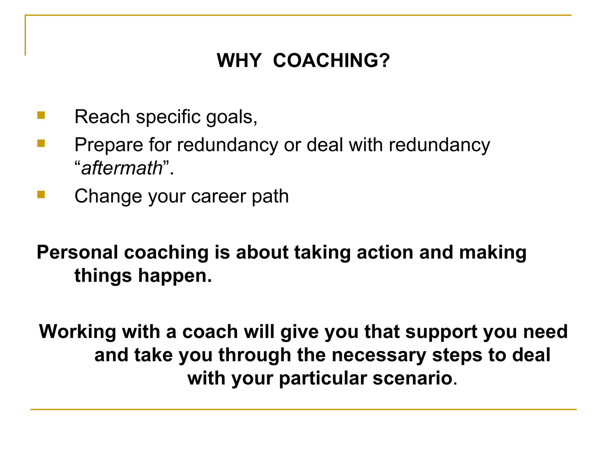 A coach helps people achieve goals and change by pushing them outside their comfort zone. Coaching can help people deal with career changes like redundancy, change careers, and improve overall well-being. Key benefits include expanding thinking, focusing on what matters, and taking action to become more productive. A life coach acts as a sounding board for challenges and keeps clients accountable to achieving goals and overcoming limitations. Coaching focuses on designing the future, not analyzing the past like therapy or counseling.