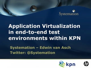 This document discusses application virtualization in test environments at KPN Systemation. It introduces LISA Virtualize, which is used within KPN to virtualize various applications including order intake orchestration, commercial order orchestration, CRM, BRM, ECM, application integration, trouble ticketing, BI, assets, product presentment, account, EAI, call center, collections, Mijn KPN, and engineer applications. An example basic virtual service is provided with 4 steps.