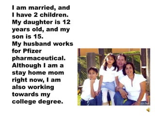 Lizbeth Romero Acosta was born in Orizaba, Veracruz and now lives in Puebla. She is 43 years old, married with two children - a 12-year-old daughter named Erika and a 15-year-old son named Mauricio. She is studying to become a public accountant at UPAEP University and enjoys traveling, spending time with her family, cooking, painting, and caring for her dog. Her goals are to finish her college degree and pursue further education in English and painting.