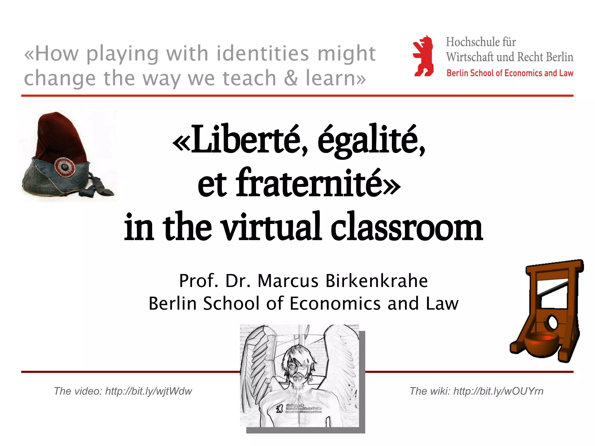 The document discusses the benefits and challenges of teaching in a virtual classroom using online identities and Web 2.0 tools. It argues that virtual identities can provide more freedom of expression, reduce power differentials, and help form online communities of interest. However, evaluating teaching quality in this environment requires new approaches and adapting to changing media. Overall, virtual classrooms offer opportunities to experiment with identities and roles in learning, but also present challenges in evaluating quality and adapting to new technologies.