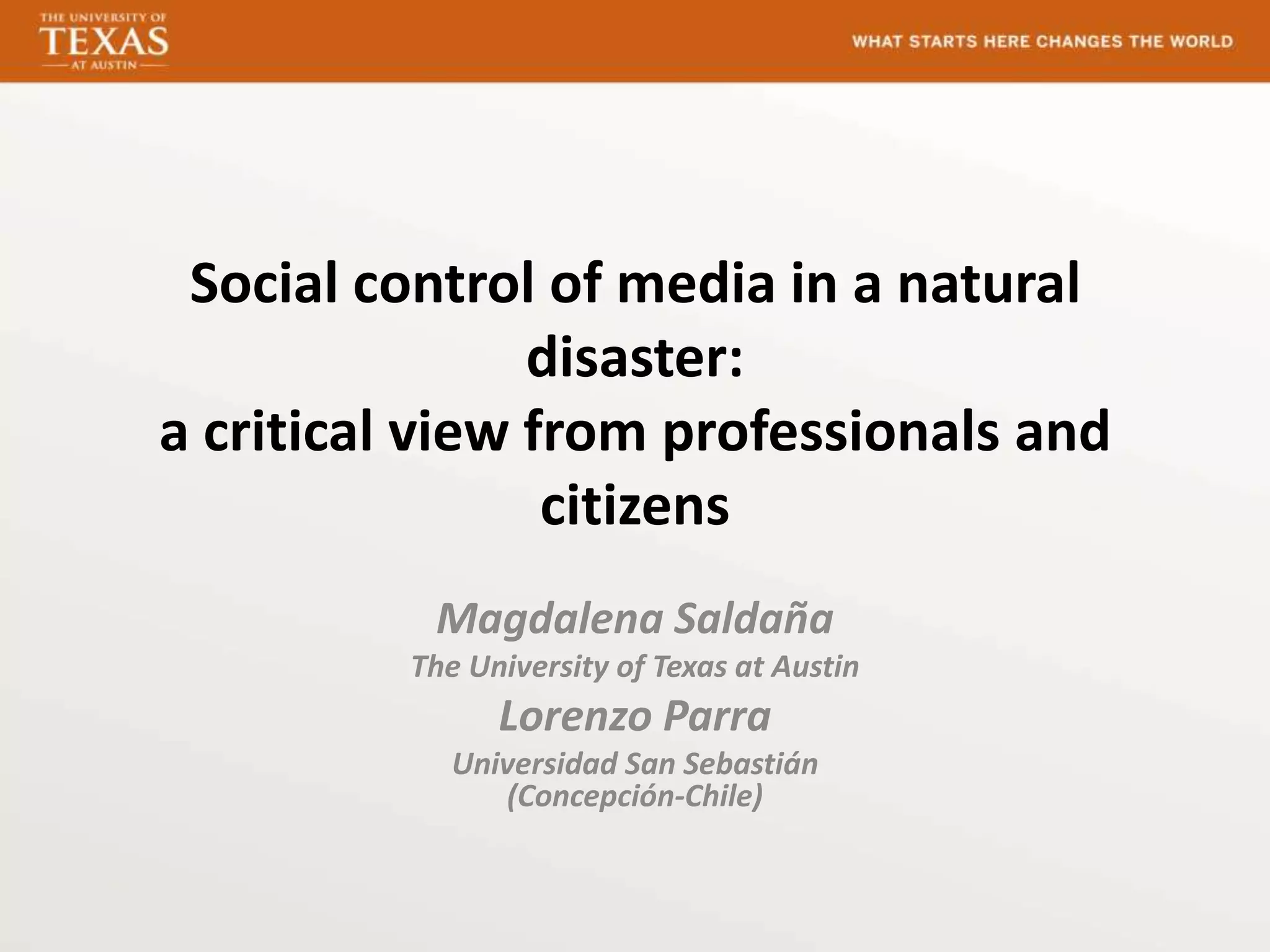 The document discusses social control of media after the 2010 Chilean earthquake. It finds that media coverage of lootings increased fear and chaos. This influenced approval of military intervention and curfews. Journalists emphasized criminal acts over disaster impacts. While media provided needed information, it also exaggerated threats and unrest. This social control was possible due to media being the main information source, lack of authorities, and public fear and insecurity after the disaster.
