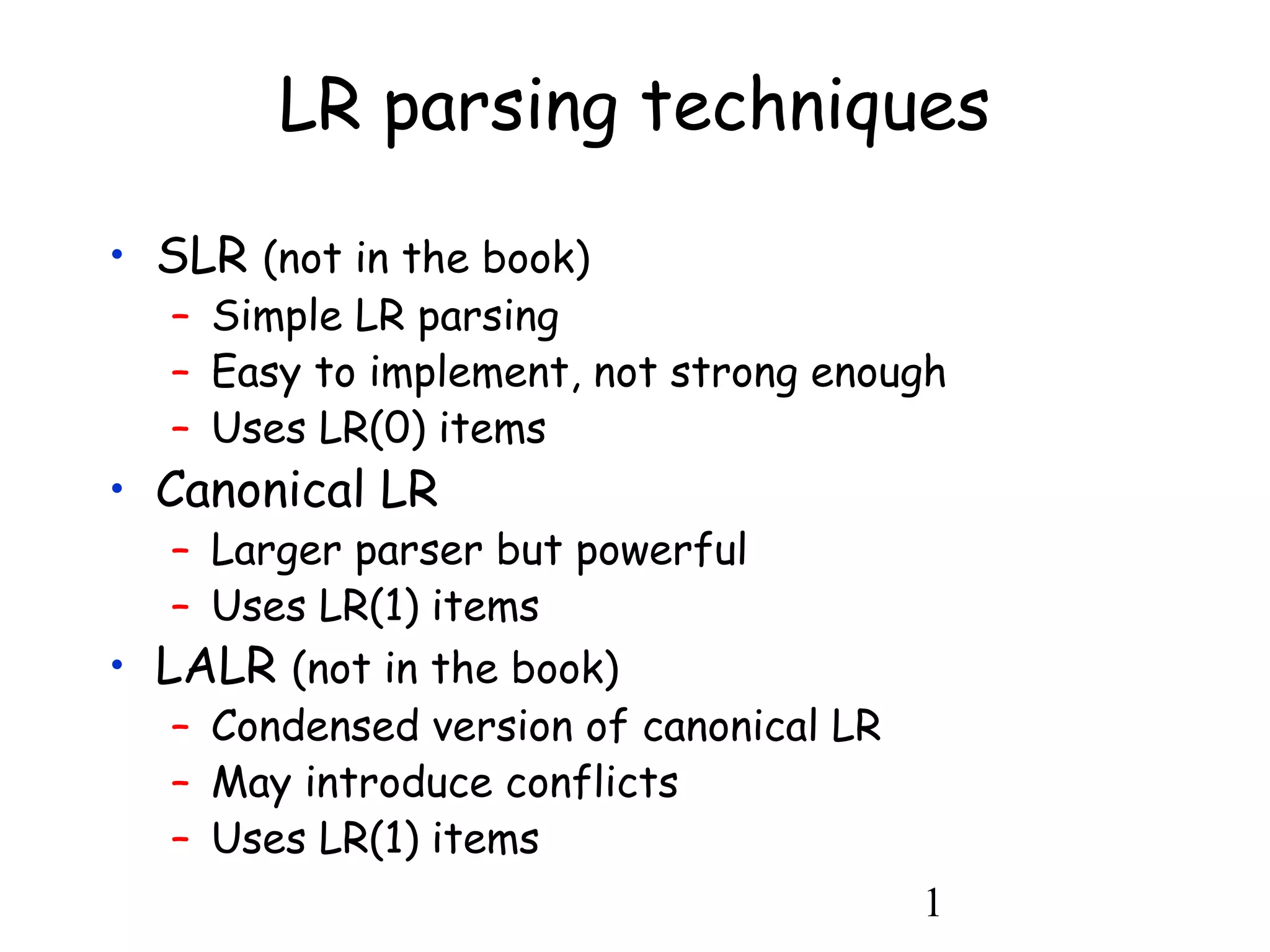 LR parsing techniques include SLR, Canonical LR, and LALR(1) parsing. SLR parsing uses LR(0) items and the FOLLOW set to resolve conflicts, but may introduce conflicts. Canonical LR parsing uses LR(1) items which include lookahead information to avoid conflicts found in SLR parsing. LALR(1) parsing reduces the number of states compared to Canonical LR by merging states with the same core items. LALR(1) can introduce reduce/reduce conflicts, while SLR and Canonical LR can have shift/reduce conflicts.