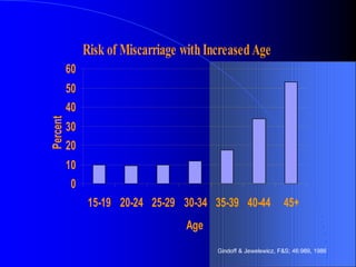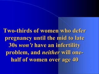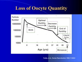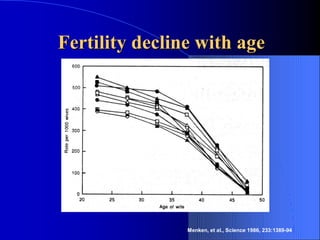 The document discusses reproductive aging and its impact on fertility. It notes that a woman's quantity and quality of eggs naturally declines with age starting in her mid-30s. While lifestyle factors like smoking can accelerate this decline, age remains the strongest predictor of egg quality and IVF success rates. The document reviews tests of ovarian reserve and treatments for advanced reproductive aging, concluding it's important to counsel patients on realistic expectations and consider alternatives like egg donation if natural conception is unlikely within 3-4 months.