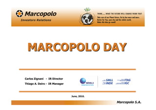 The document provides an agenda and overview for Marcopolo Day, which discusses Marcopolo as a leading bus manufacturer. It summarizes key information about the bus market and Marcopolo's position in it, including operating and financial highlights showing increased production, market share, sales, and profitability in recent years. Charts depict trends in areas like the Brazilian bus fleet size and average age.