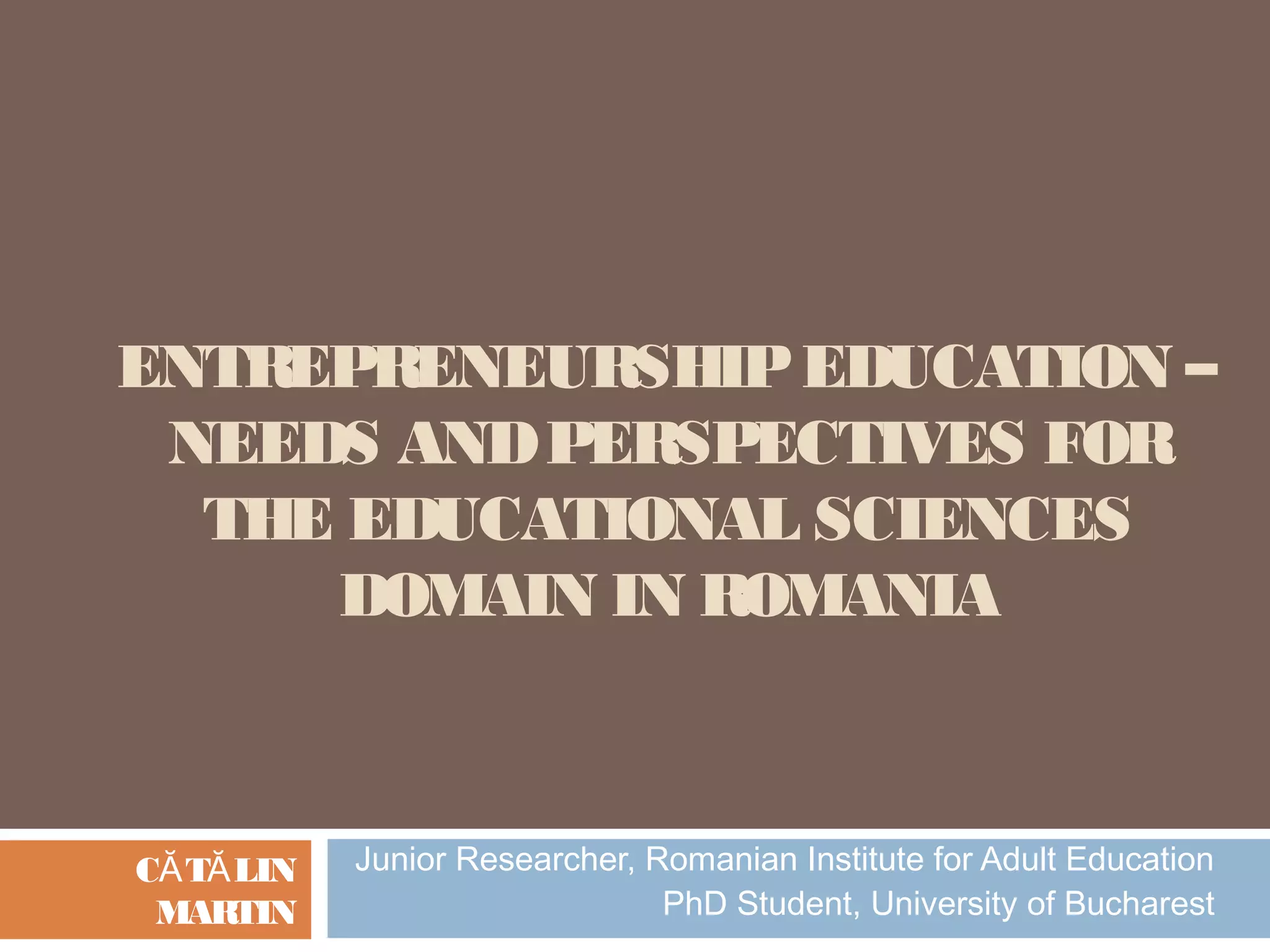 The document discusses the need for entrepreneurship education in Romania and the perspectives of students in educational sciences programs. A survey of 168 students found that over 30% want to start a business within 4 years, particularly in education, trade, or services. Students said they lack money, skills, and business ideas to become entrepreneurs. Over half found an entrepreneurship course would be useful to develop skills through activities like visiting businesses. The conclusions were that developing transversal competencies through such a course could help students in educational sciences prepare for careers outside teaching and improve entrepreneurial intentions.