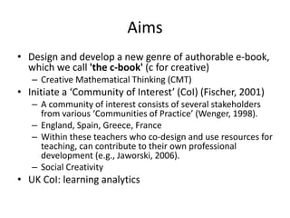 This document discusses the development of "cBooks", which are creative eBooks for mathematical thinking. The goal is to initiate a "Community of Interest" involving teachers from several European countries who can collaborate on designing cBook resources. CBooks act as "boundary objects" that facilitate crossing boundaries between different communities of practice. Factors like community size, integrating the work into normal jobs, and a sense of ownership over products can influence a community's efficiency. The document examines issues involved in building an international collaborative community around developing these types of mathematical resources.