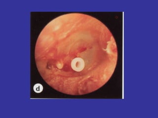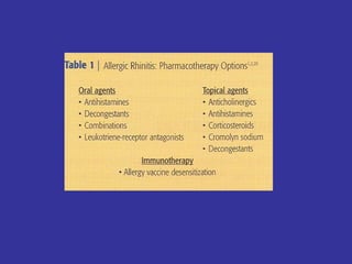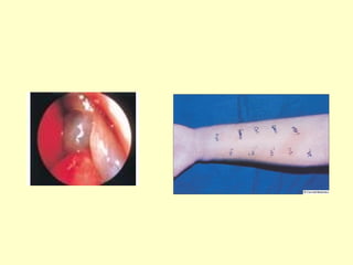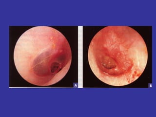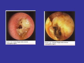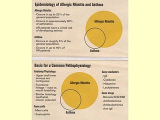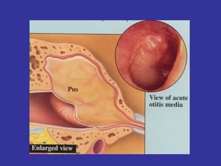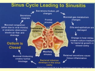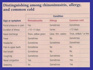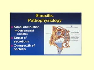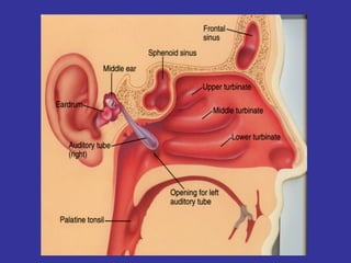 This document provides information on upper and lower respiratory pathologies including sinusitis, otitis externa, otitis media, and allergic rhinitis. It defines the different types of sinusitis and describes the anatomy and development of the paranasal sinuses. It also discusses the etiology, signs and symptoms, diagnosis, and treatment of otitis externa, otitis media, and allergic rhinitis.