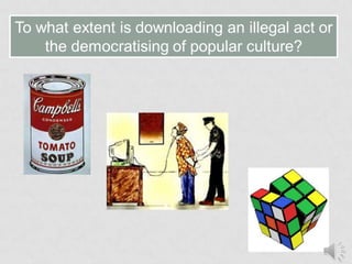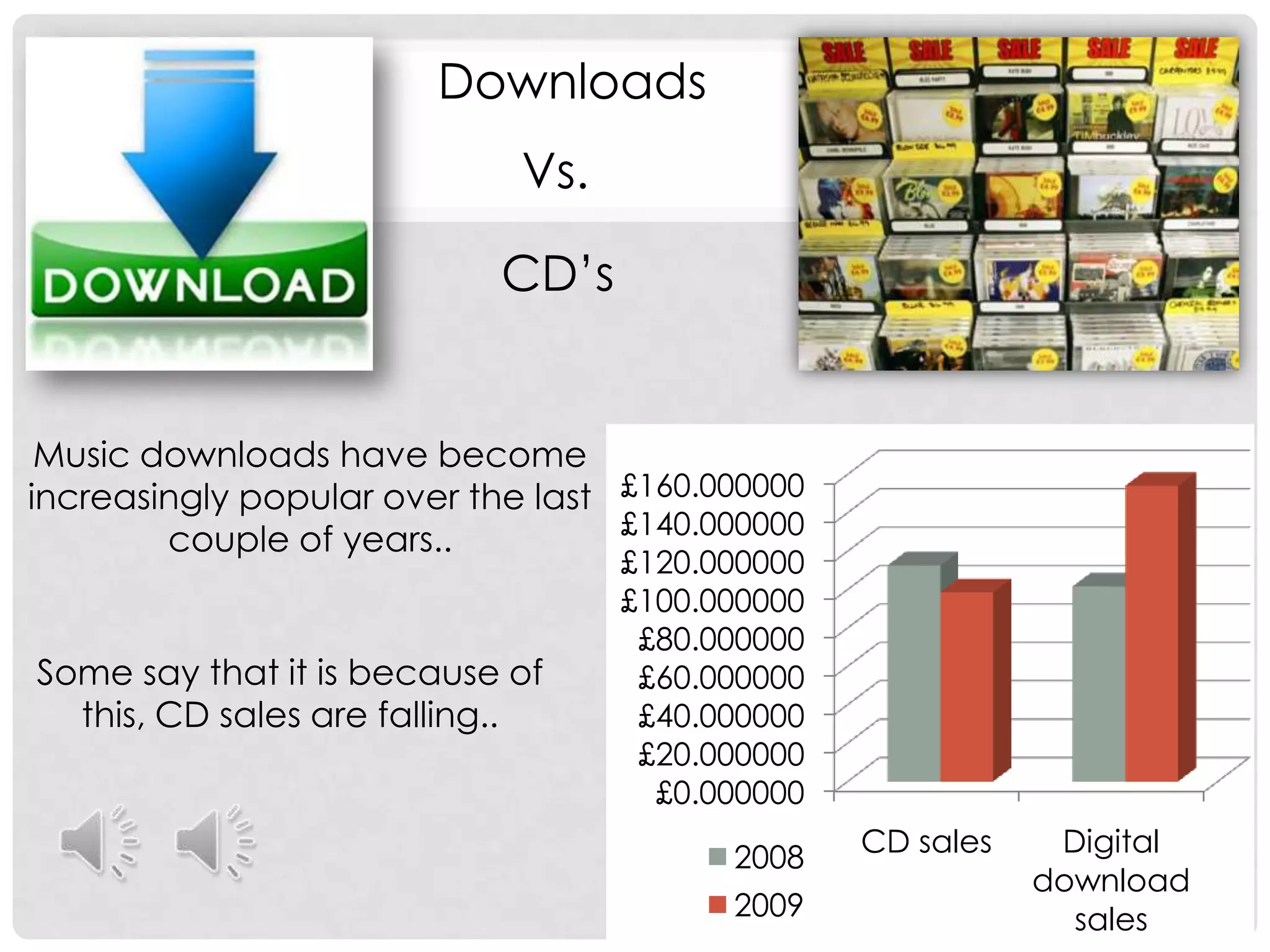 Music downloads have become increasingly popular over the last few years, while CD sales are falling. However, illegal downloading of music through file sharing sites is still a major problem, depriving artists and the music industry of significant revenue. While legal music downloading has increased and helped grow the UK music industry, illegal downloading remains widespread, with millions downloading music illegally each year. The music industry and government are continuing efforts to curb piracy through warnings and potential legal action, but addressing the issue remains an ongoing challenge.