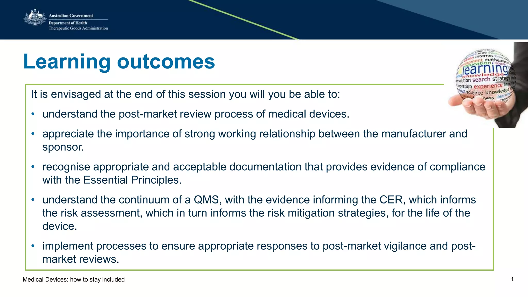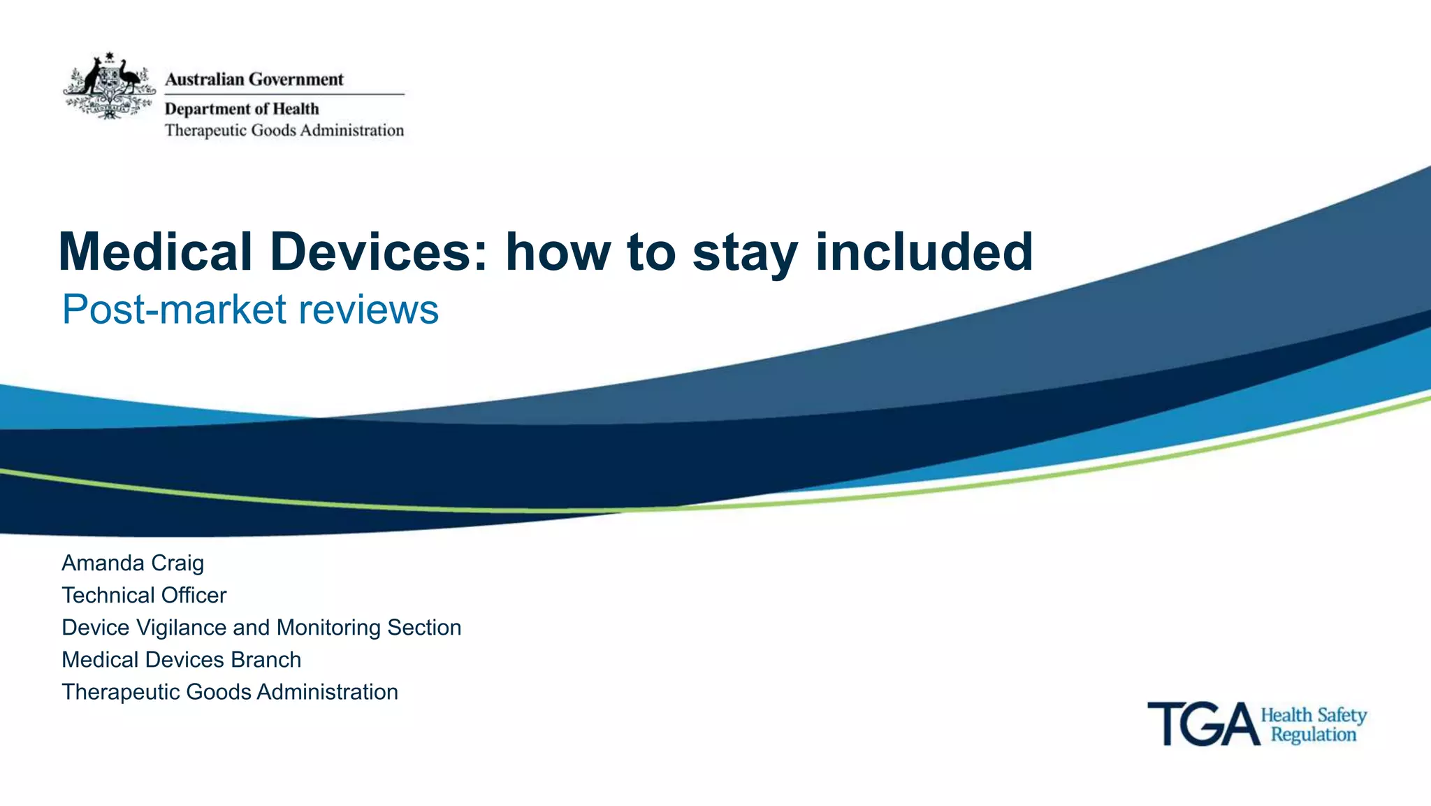 The document outlines the post-market review process for medical devices managed by the TGA, emphasizing the need for strong collaboration between manufacturers and sponsors, as well as the importance of proper documentation for compliance. It provides insights into monitoring, risk assessment, and the types of evidence required during reviews, including case studies on heart valves and tissue morcellators. Additionally, it highlights key messages for manufacturers on submission requirements and encourages adherence to established guidelines.