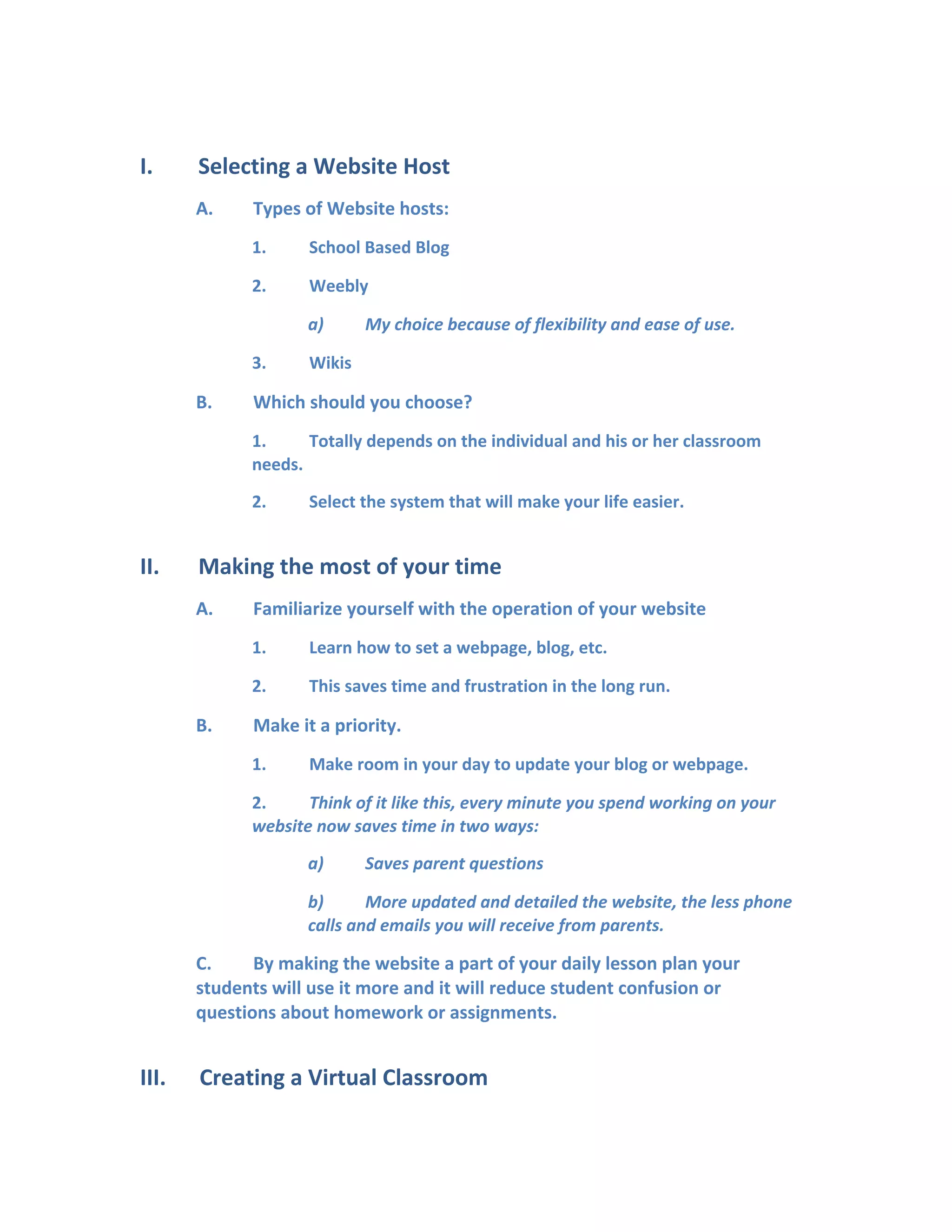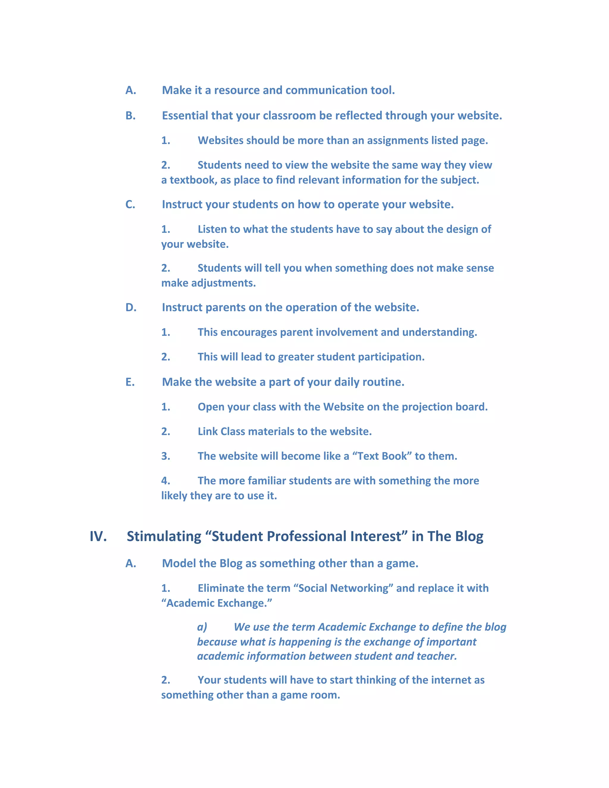 The document provides guidelines for selecting a website host and utilizing blogging as an educational tool to enhance classroom communication and student engagement. It emphasizes the importance of familiarizing oneself with website operations, creating a virtual classroom, and using various blogging formats and tools to foster academic dialogue among students. Overall, it asserts that effective blogging can significantly impact student learning and parental involvement.