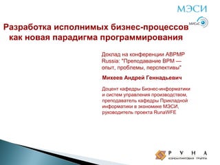 Доклад Андрея Михеева на конференции ABPMP Russia обсуждает новую парадигму программирования, связанную с разработкой исполнимых бизнес-процессов, которые помогают значительно повысить производительность труда и ускорить процесс разработки. Он также подчеркивает важность подготовки специалистов с процессным мышлением для успешной реализации этих систем, а также внедрение курса обучения бизнес-процессам на базе открытого программного обеспечения. Участие в конференции направлено на анализ и развитие методов повышения эффективности бизнеса с использованием современных технологий.
