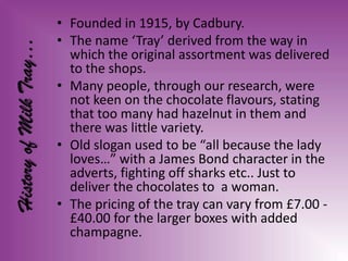 Milk Tray is a chocolate assortment brand founded in 1915 by Cadbury that was originally delivered to shops in trays. While the brand was known for its James Bond-inspired advertisements of men delivering chocolates to women, many consumers found there was too little variety in the hazelnut-dominant flavors. This document discusses ideas for improving Milk Tray, such as changing flavors for holidays, bringing back the Milk Tray bar, altering the slogan to focus on togetherness, and targeting both men and women of various ages through television and poster advertising campaigns.