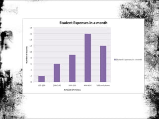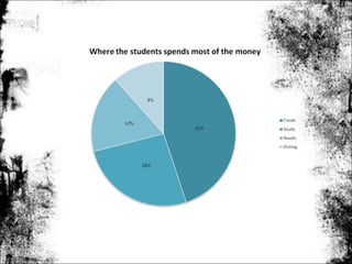This document presents the objectives, hypothesis, methodology, results, and conclusion of a mini project studying how much money students at UPSI spend per month. The objectives are to determine if PTPTN loans are sufficient for expenses and quantify monthly spending. A hypothesis is that loans do not fully cover costs. Surveys of 50 students collected data on expenses per semester and month. Most students spent RM2000-RM3999 per semester and RM300-RM499 monthly. Most money was spent on food. The conclusion is that while loans help, they do not fully cover expenses as hypothesized.