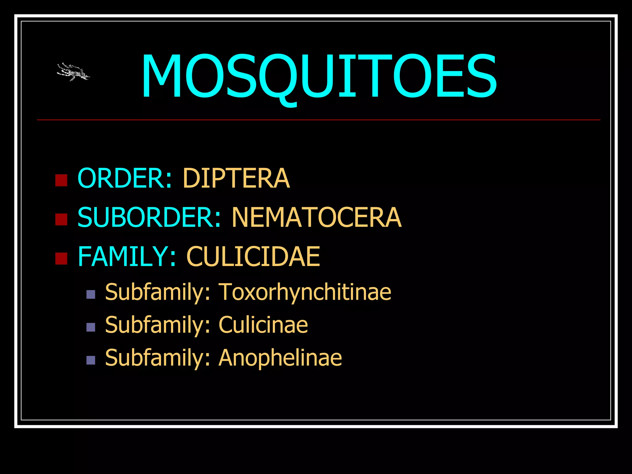 SUBORDER: NEMATOCERA FAMILY: CULICIDAE Subfamily: Toxorhynchitinae Subfamily: Culicinae Subfamily: Anophelinae