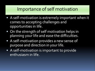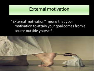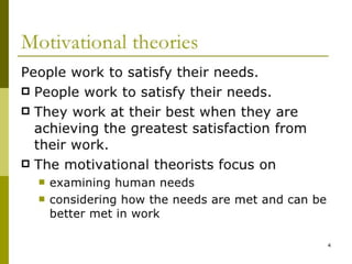 Motivation is the driving force that causes the will to act. It comes from inner desires to fulfill needs and move in a particular direction. Motivation is key to managing employees, as it determines what they will do. It arises from an interaction between the individual and their situation. Motivated people will exert more effort than the unmotivated. Motivation theories like Maslow's hierarchy of needs and Herzberg's hygiene-motivation theory help explain human motivation. Goal setting, participation, feedback and performance reviews are important for motivation in the workplace.