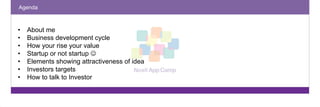 Tomas Martunas discusses key elements for developing an idea into a sustainable business. He outlines the typical business development cycle from pre-seed to later stage funding. Martunas also discusses factors that show the attractiveness of an idea such as addressing large markets, focusing on rich customers, and solving important problems for customers. Additionally, he notes important elements of sustainable startups include having a clear purpose, focus, thinking differently than competitors, and building an agile team. Martunas advises founders on presenting ideas to investors by discussing traction, revenues, costs, valuation, and plans for investment.