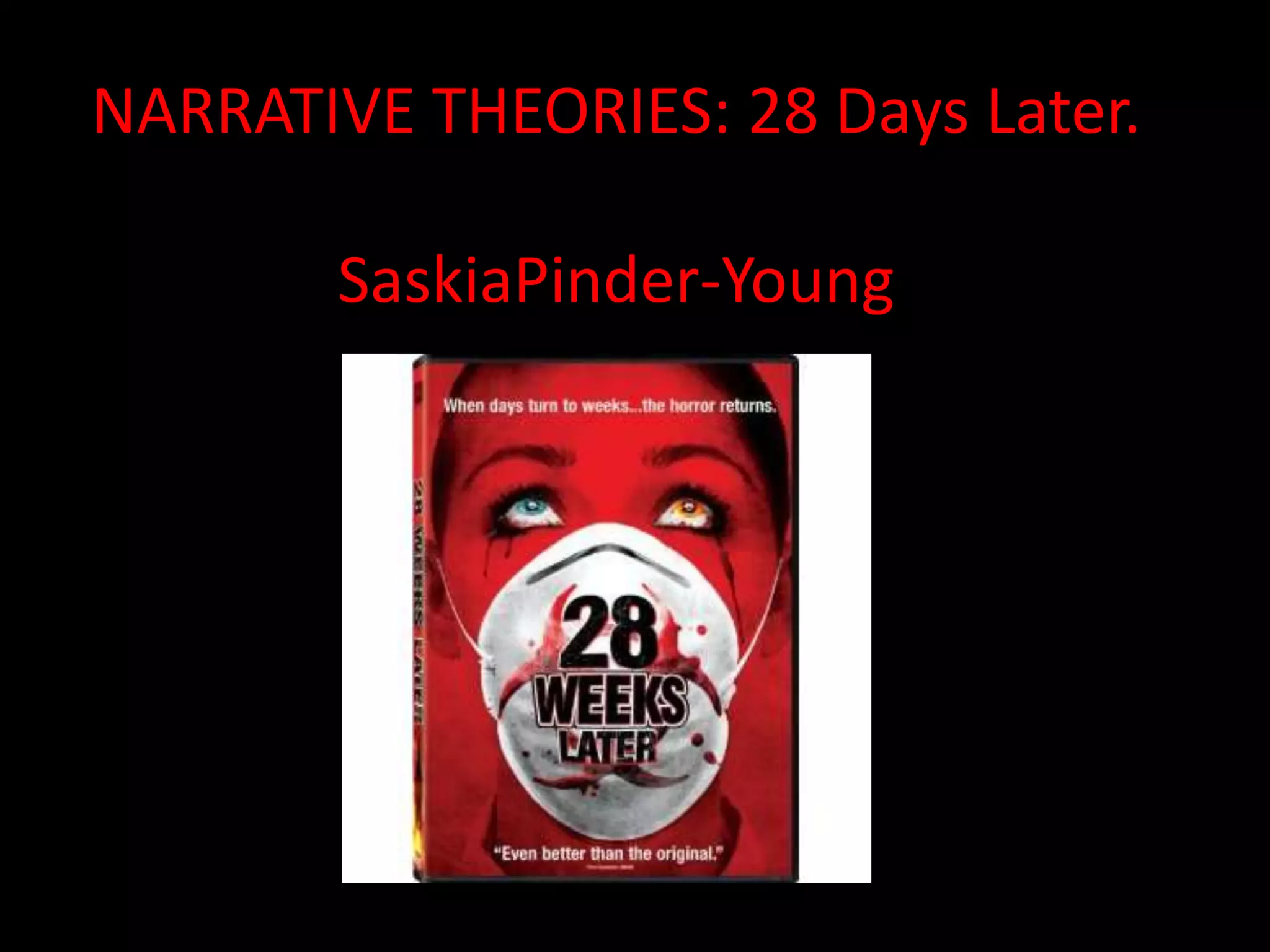 The opening scene of 28 Days Later sets up suspense and mystery. It begins in a dark, cramped room where a group of diverse survivors are barricaded with candles as their only light source. They seem scared of something outside but the audience does not know what. When a little boy enters, he hints at an unnatural threat outside. A zombie then breaks in, revealing the villains. The audience can infer the story takes place in the British countryside and follows the horror genre conventions of survivors threatened by murderous creatures. Key questions are left around why the group is hiding and what caused the zombie outbreak.