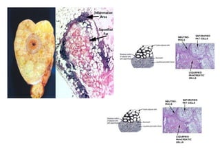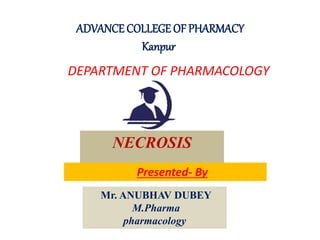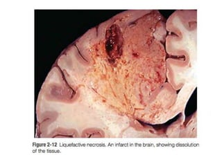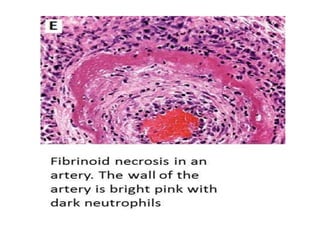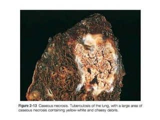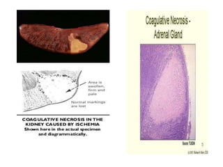 Necrosis is the premature death of cells in living tissue due to factors like lack of blood flow, radiation, chemicals, or physical trauma. There are several types of necrosis including coagulative, liquefactive, caseous, fat, and fibrinoid necrosis. Coagulative necrosis preserves cell structure, while liquefactive necrosis completely breaks cells down. Caseous necrosis is seen in tuberculosis and forms cheesy deposits. Fat necrosis destroys lipid deposits. Fibrinoid necrosis involves immune complex deposition in blood vessels. Necrosis causes inflammation and cannot be reversed, unlike apoptosis which is programmed cell death.