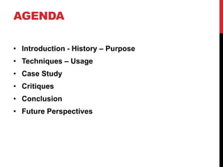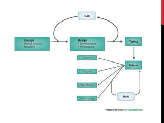 The document provides an overview of neuromarketing, including its history, techniques, case studies, critiques, and future perspectives. Neuromarketing uses technologies like EEGs and fMRIs to measure brain activity and understand consumers' emotional engagement and memory formation related to products and ads. A key case study examined consumer preferences when drinking Coke vs Pepsi while being scanned; findings revealed cultural influences on brand perceptions. Both pros and cons are discussed, such as its ability to target the unconscious mind but also potential ethical issues with "brainwashing" techniques. The future of neuromarketing is debated, with some believing it will become standard for product development while others question if added regulation may be needed.