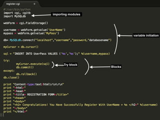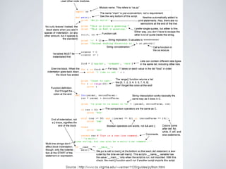 This document provides an overview of the Python programming language. It discusses Python's history, versions, paradigms, data types, control flow statements, functions, classes, and applications. Key points include that Python was created in the late 1980s and influenced by other languages, it supports multiple programming paradigms like object-oriented and functional programming, and it is widely used for web development, science, and data analysis.