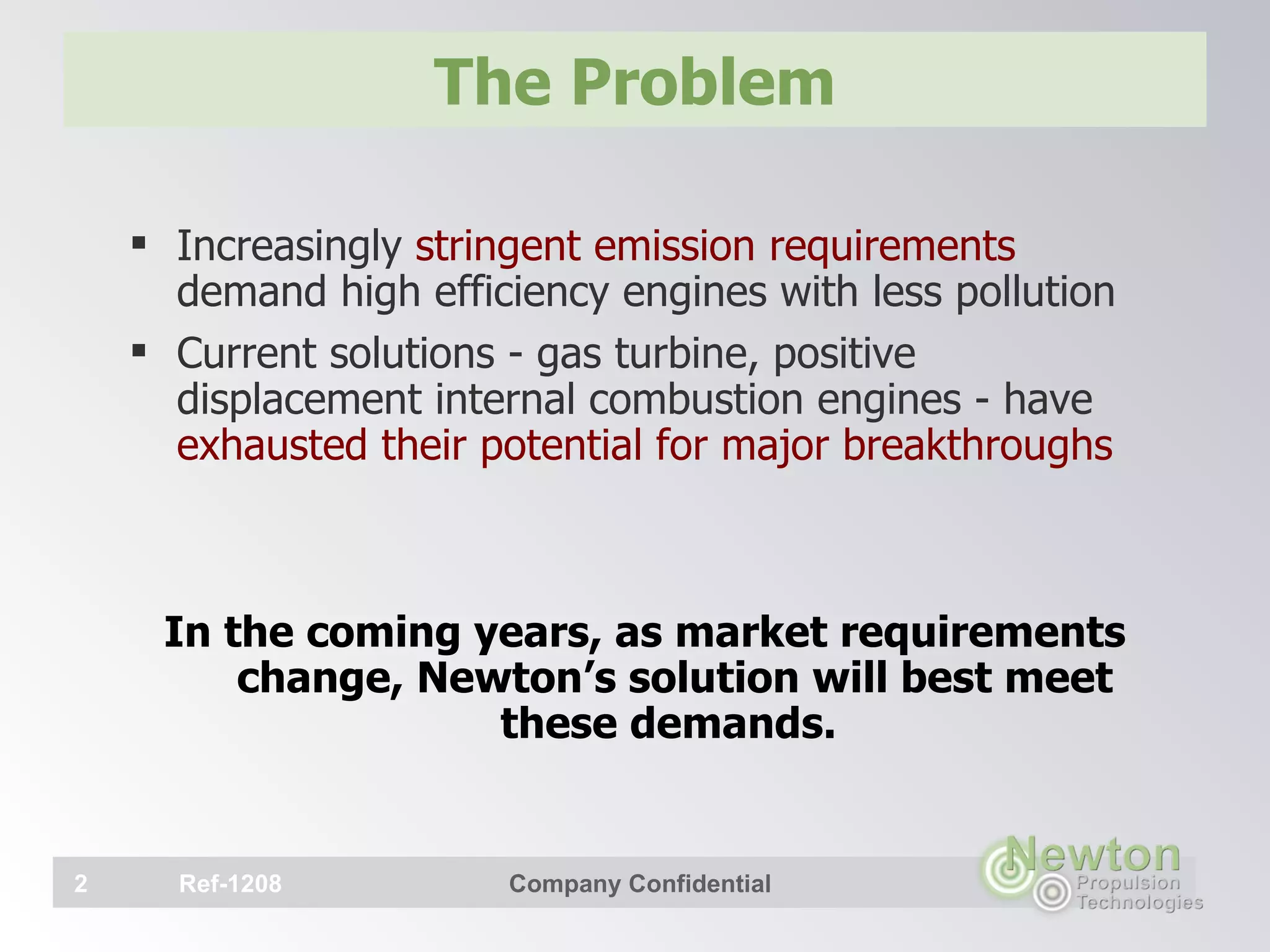 The presentation summarizes Newton Propulsion Technology's engine innovation that combines aspects of positive displacement internal combustion engines and gas turbines. It addresses increasingly stringent emission standards by offering high efficiency and reduced pollution. An alpha prototype has been built and tested, demonstrating the concept. The innovation has patent applications submitted and is seeking private financing and grants to further develop the technology for applications in land, marine, aviation, and power generation markets.