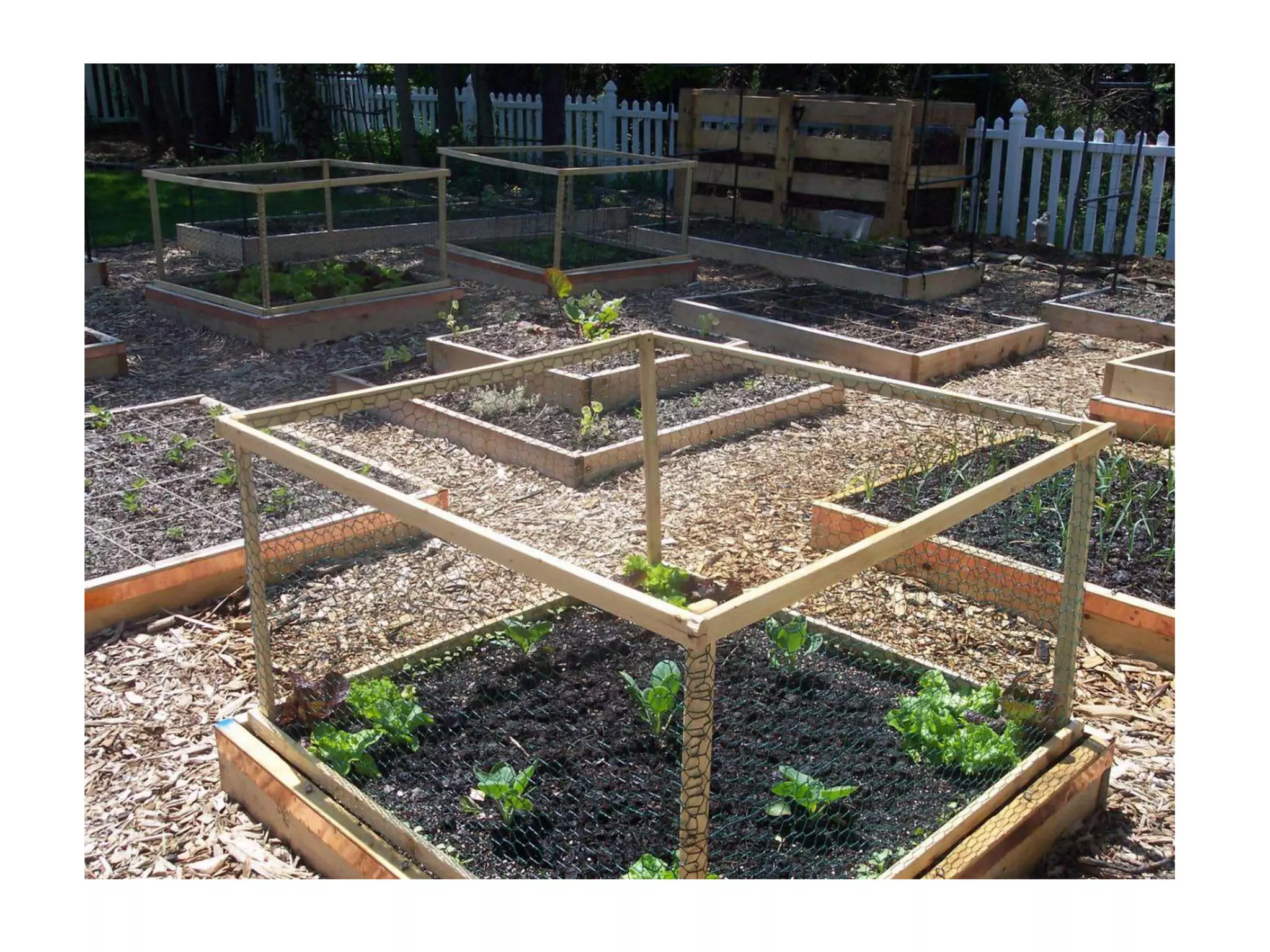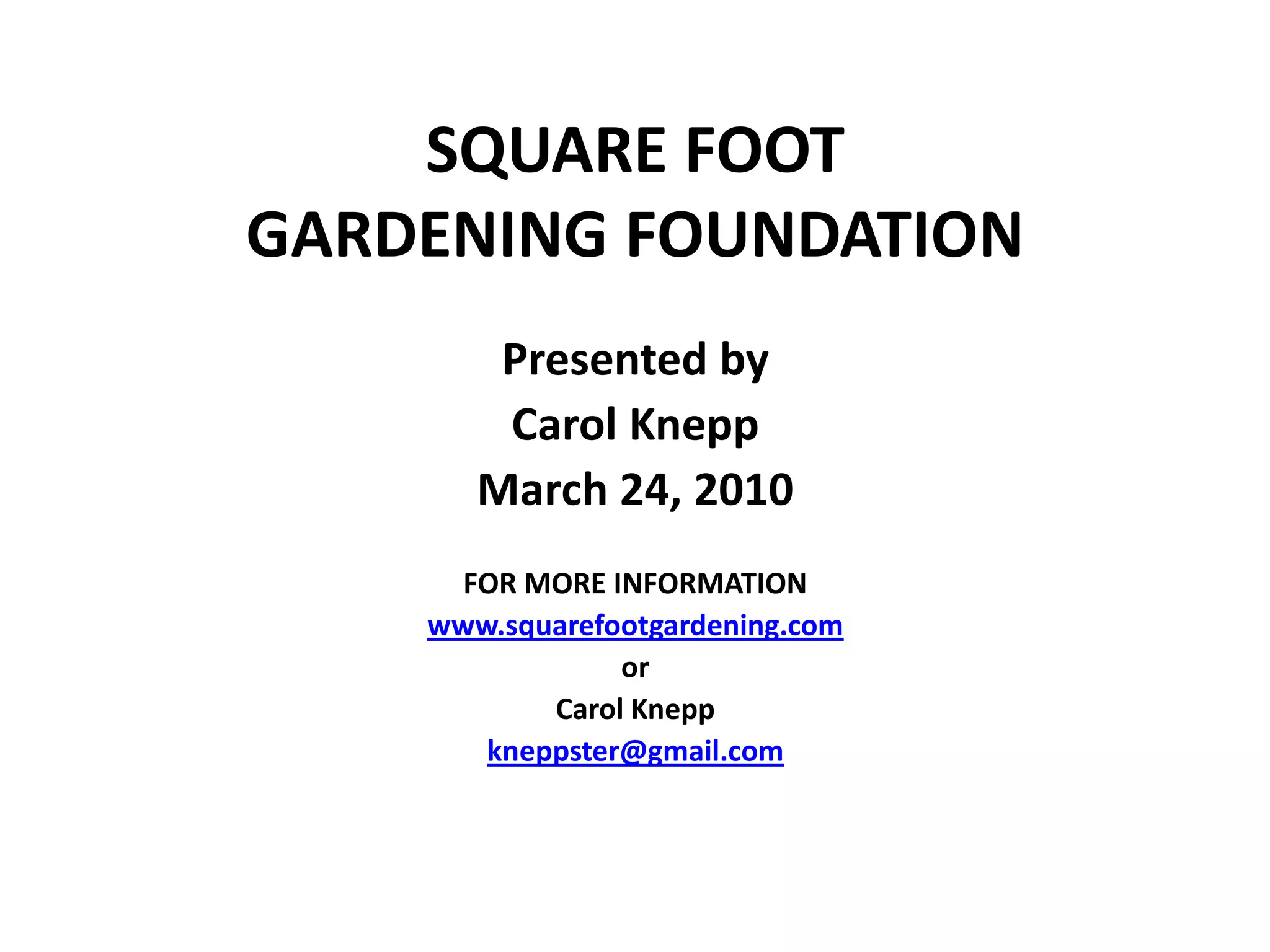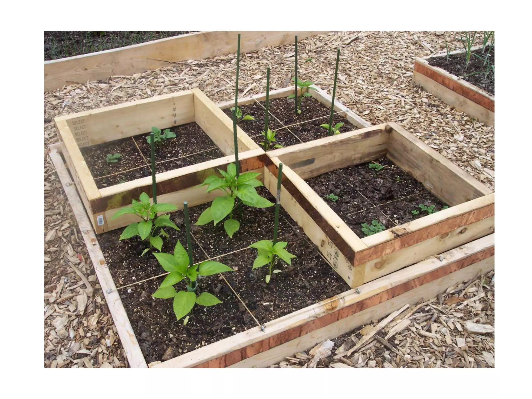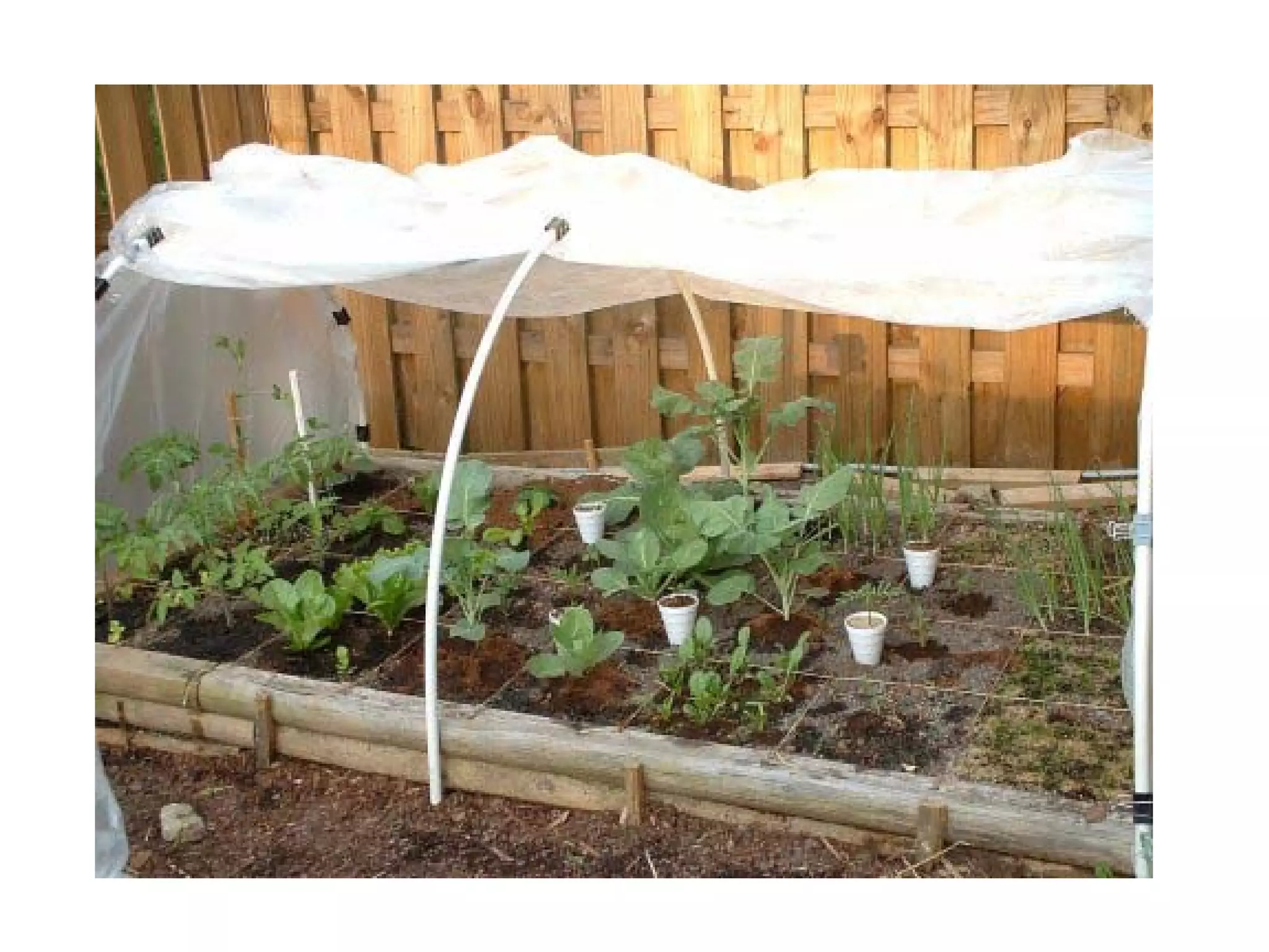 The document discusses the basics of square foot gardening. It recommends choosing a sunny location for garden boxes that are 6 inches deep and made of various materials. The boxes are divided into 1 square foot sections using grids. An ideal soil mixture called "Mel's Mix" is recommended, consisting of 1/3 peat moss, 1/3 vermiculite and 1/3 compost. A variety of crops can be grown in each square foot section by staggering plantings. Vertical frames can expand growing space and protect against critters. The document provides details on building boxes, soil preparation and composting.