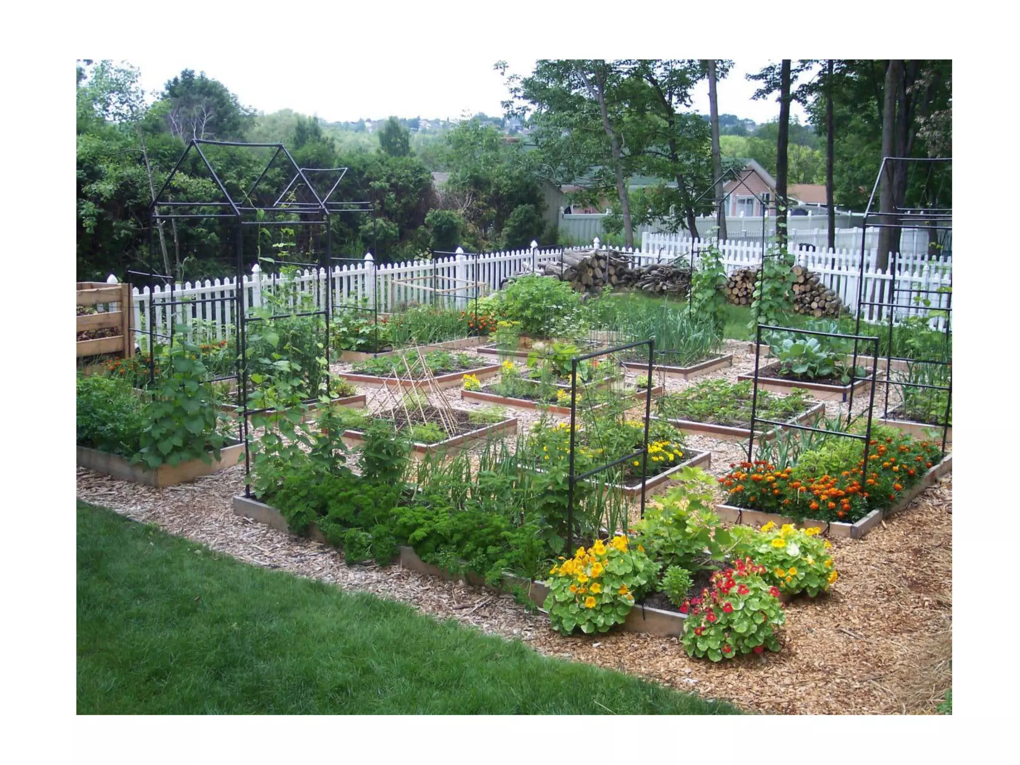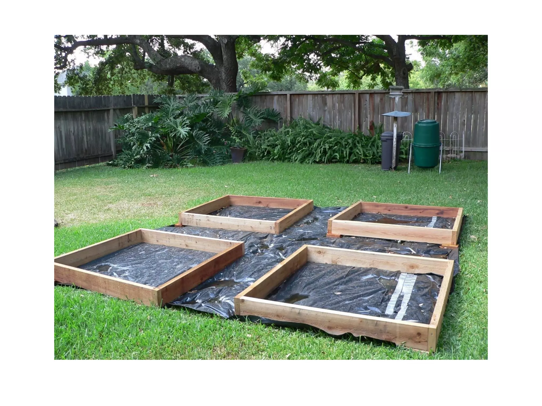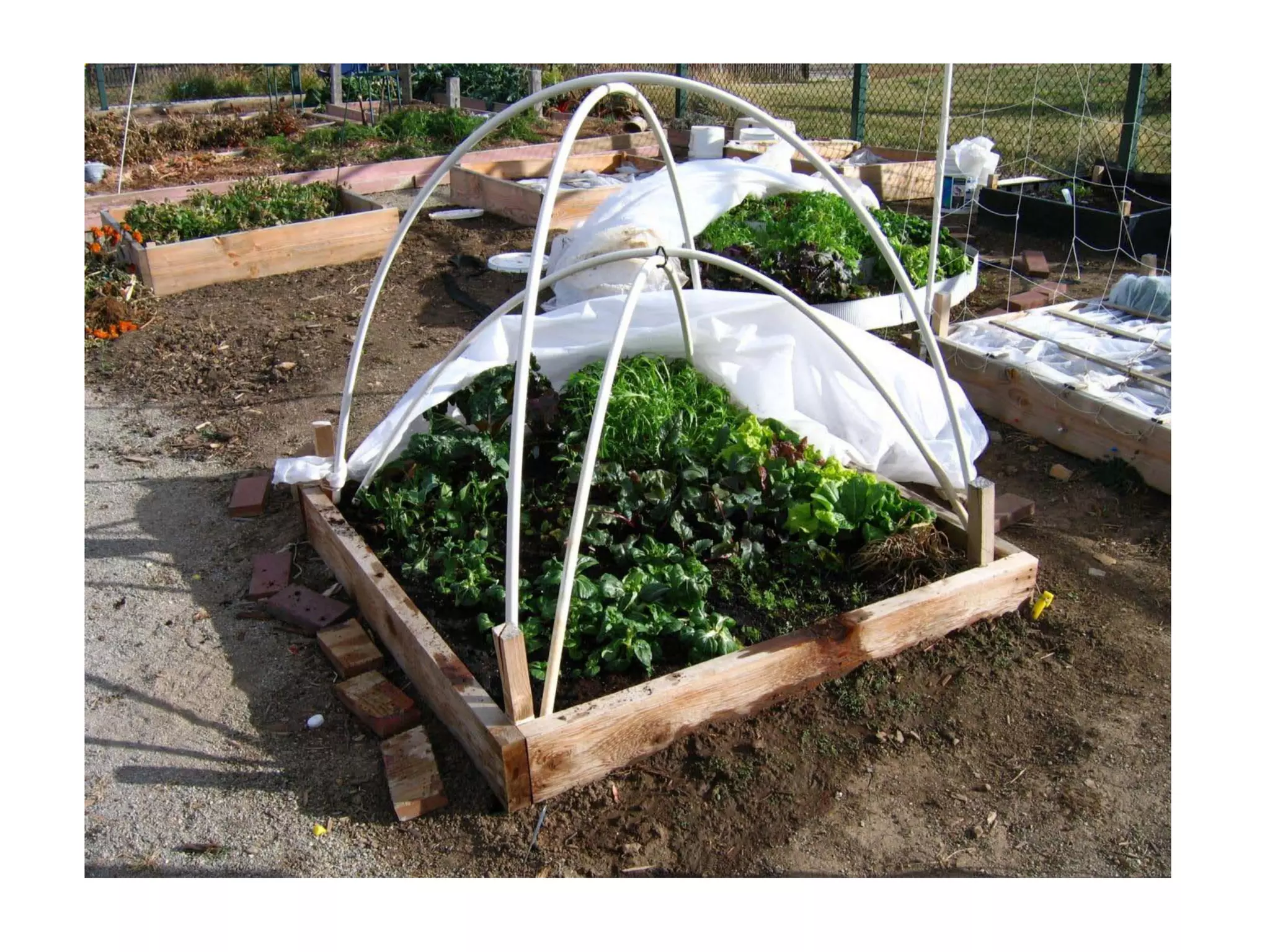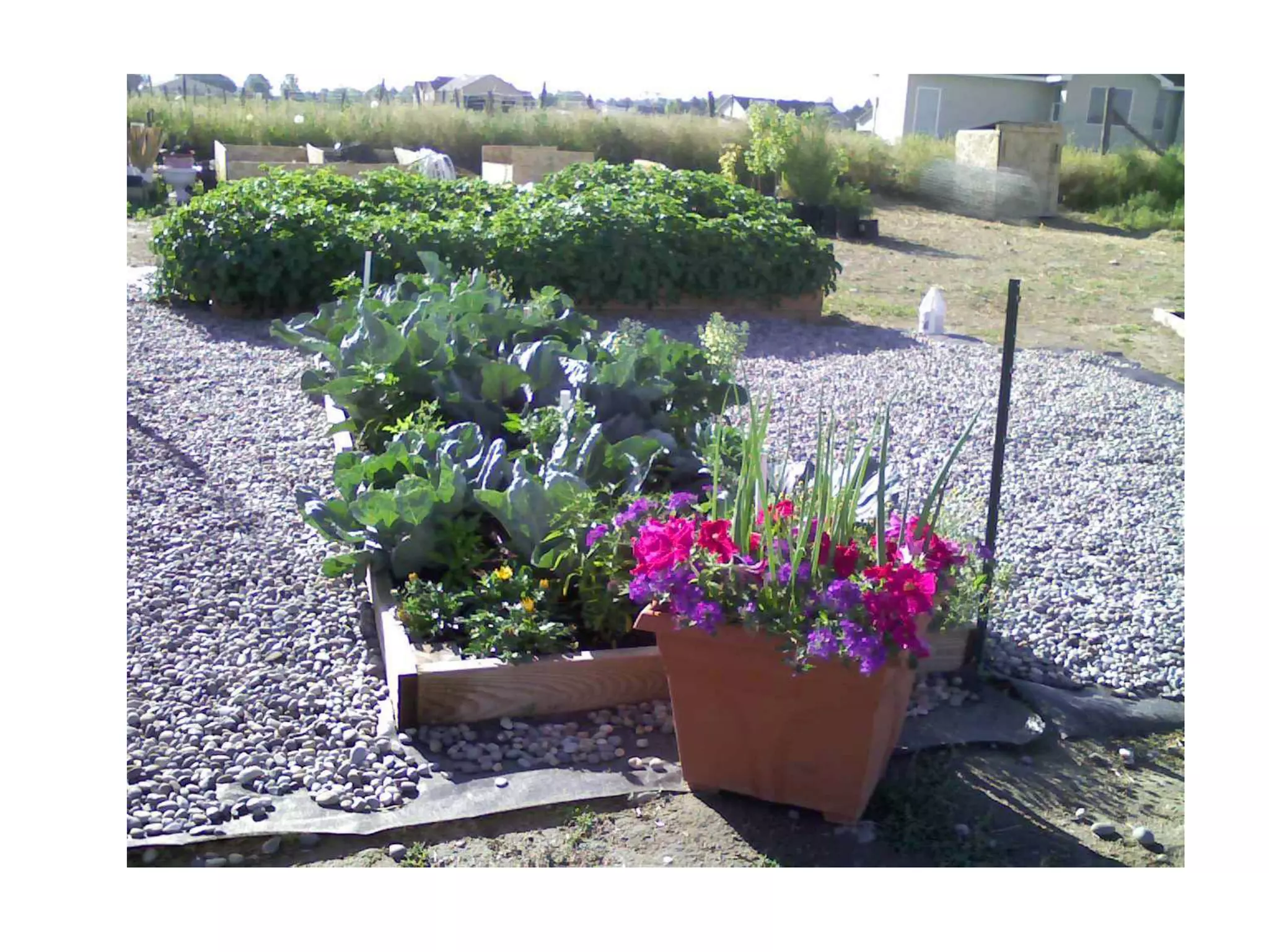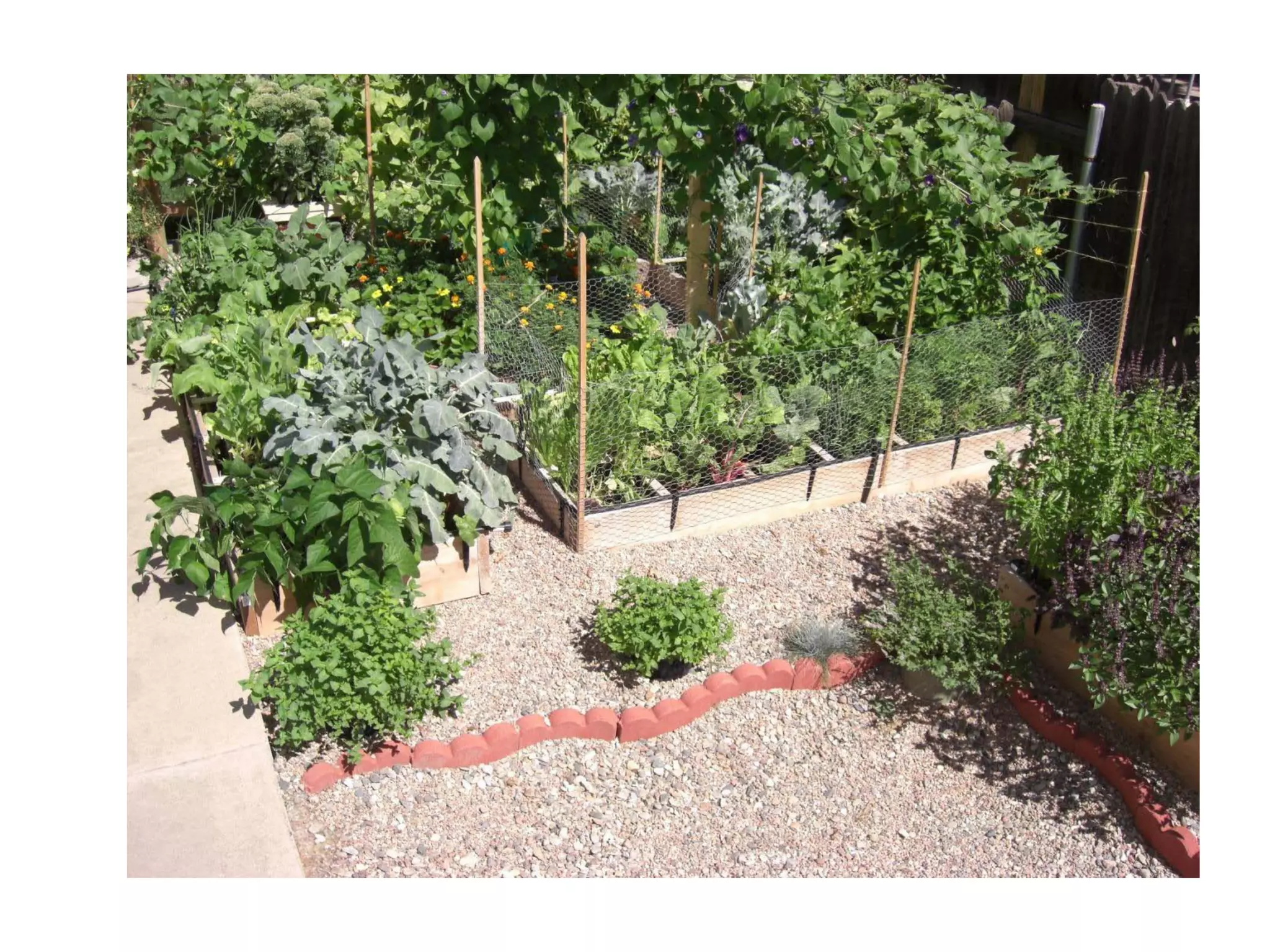 The document discusses the basics of square foot gardening. It recommends choosing a sunny location for garden boxes that are 6 inches deep and made of various materials. The boxes are divided into 1 square foot sections using grids. An ideal soil mixture called "Mel's Mix" is recommended, consisting of 1/3 peat moss, 1/3 vermiculite and 1/3 compost. A variety of crops can be grown in each square foot section by staggering plantings. Vertical frames can expand growing space and protect against critters. The document provides details on building boxes, soil preparation and composting.