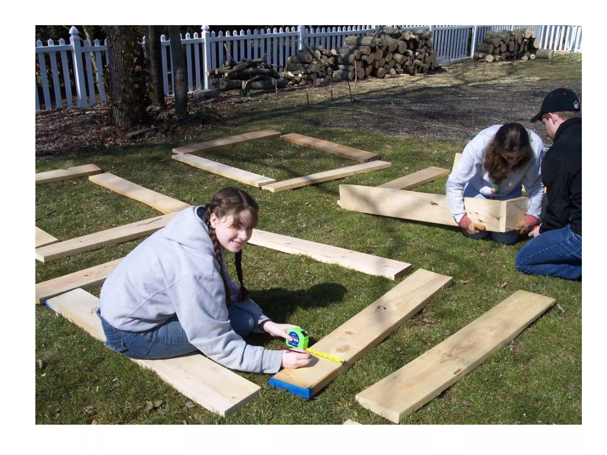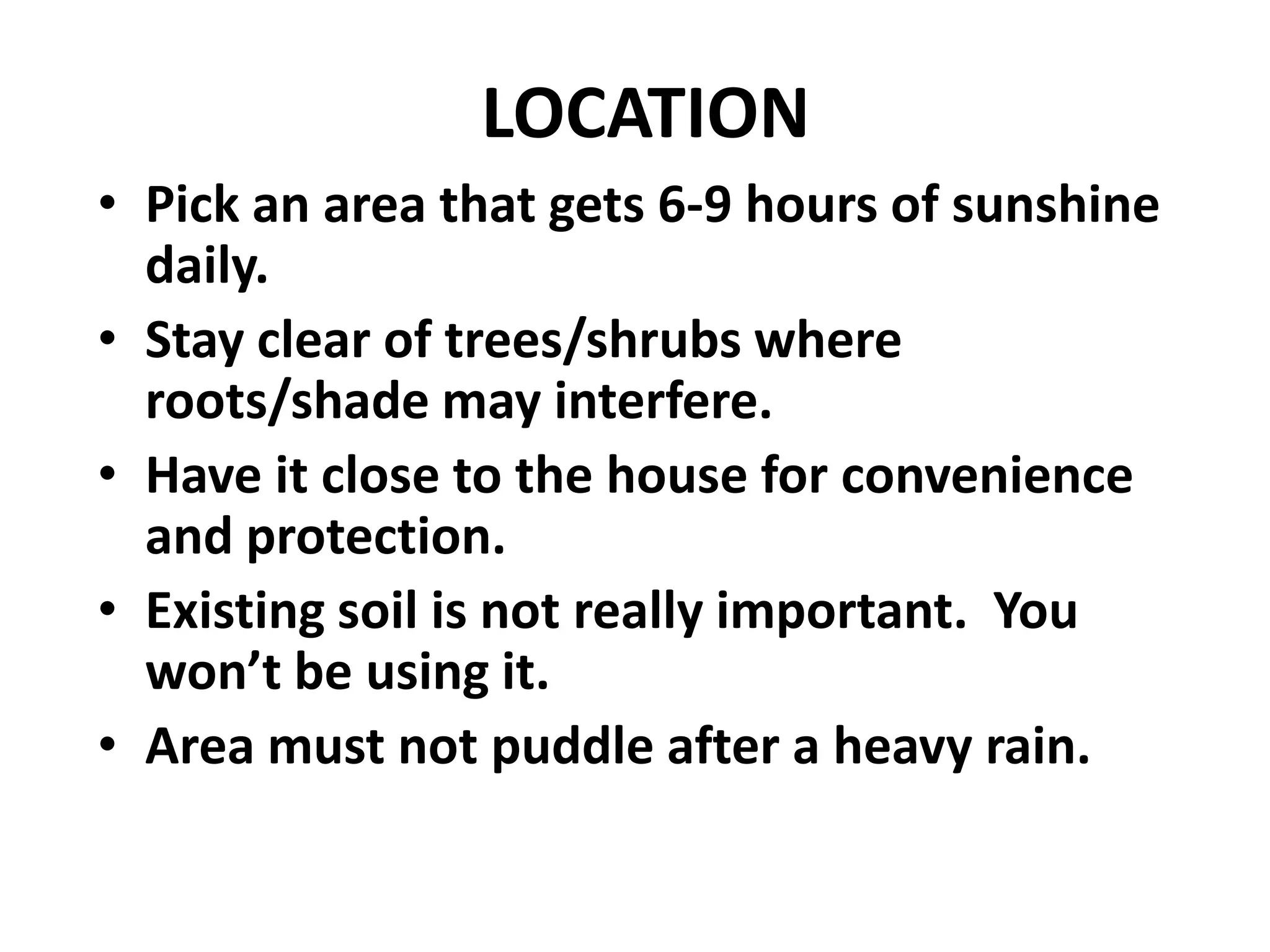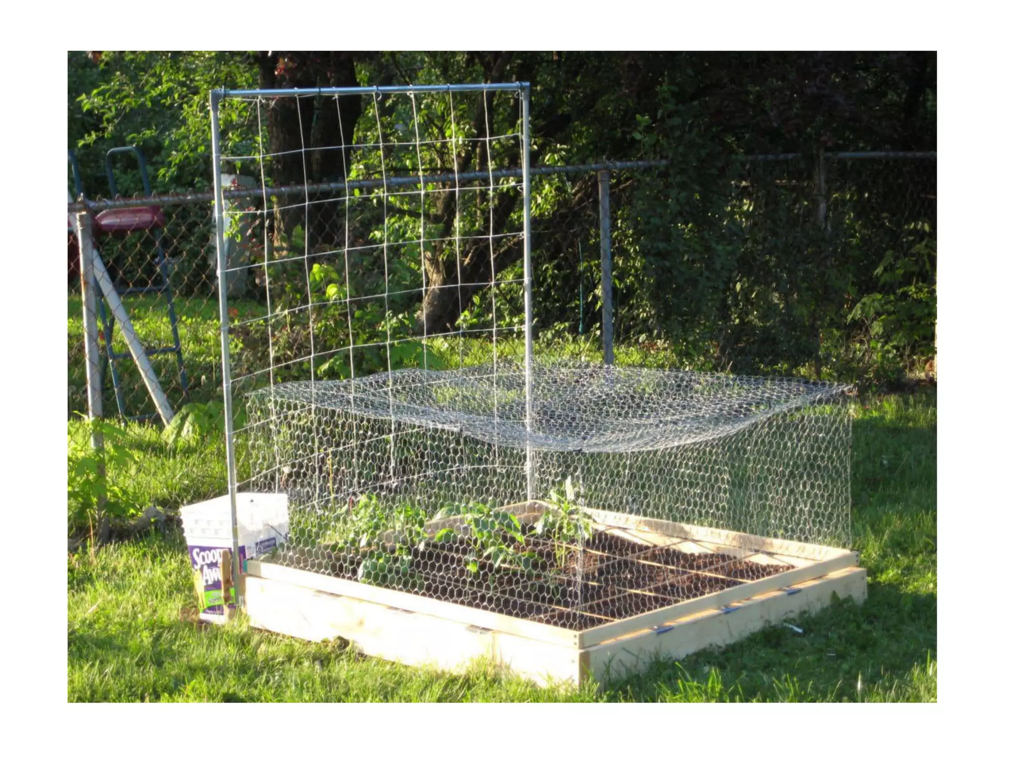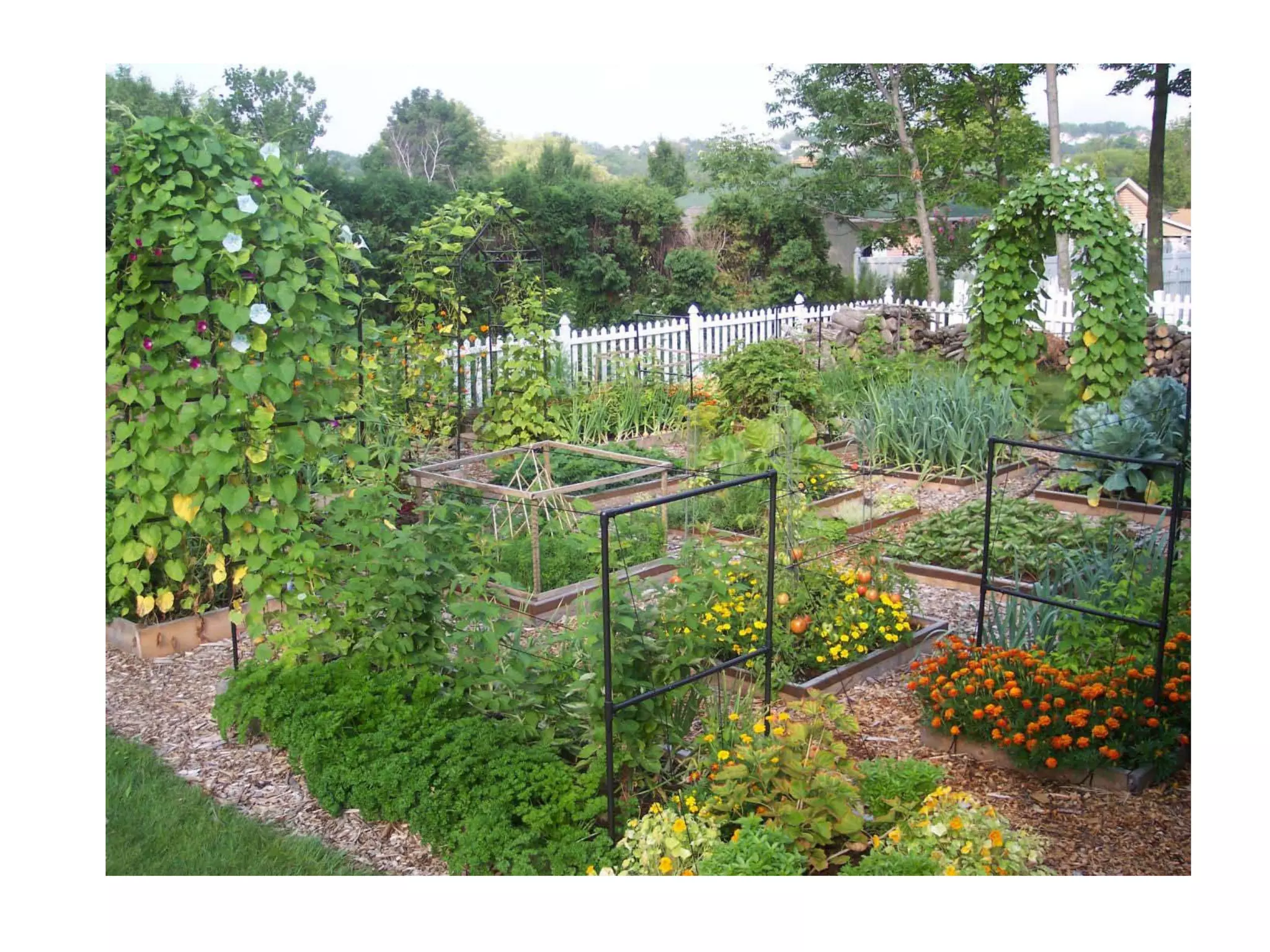 The document discusses the basics of square foot gardening. It recommends choosing a sunny location for garden boxes that are 6 inches deep and made of various materials. The boxes are divided into 1 square foot sections using grids. An ideal soil mixture called "Mel's Mix" is recommended, consisting of 1/3 peat moss, 1/3 vermiculite and 1/3 compost. A variety of crops can be grown in each square foot section by staggering plantings. Vertical frames can expand growing space and protect against critters. The document provides details on building boxes, soil preparation and composting.