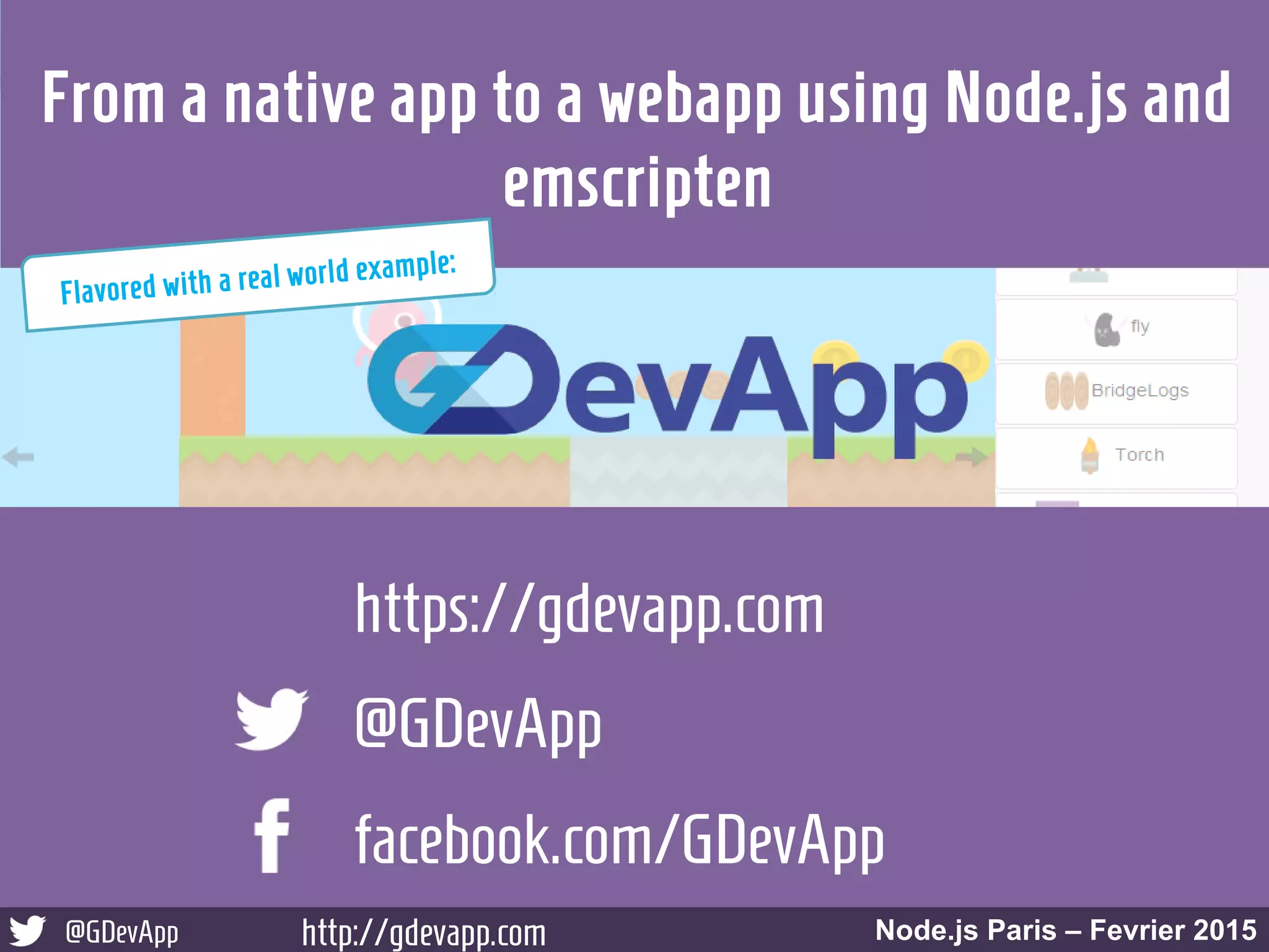 The document discusses transitioning a native app to a web app using Node.js and Emscripten, detailing the technical processes involved, including class exposure and memory management. It also highlights the advantages of Emscripten for porting native components and libraries to a web environment without significant alterations. The overall aim is to demonstrate how to effectively utilize these technologies to maintain performance akin to native applications.