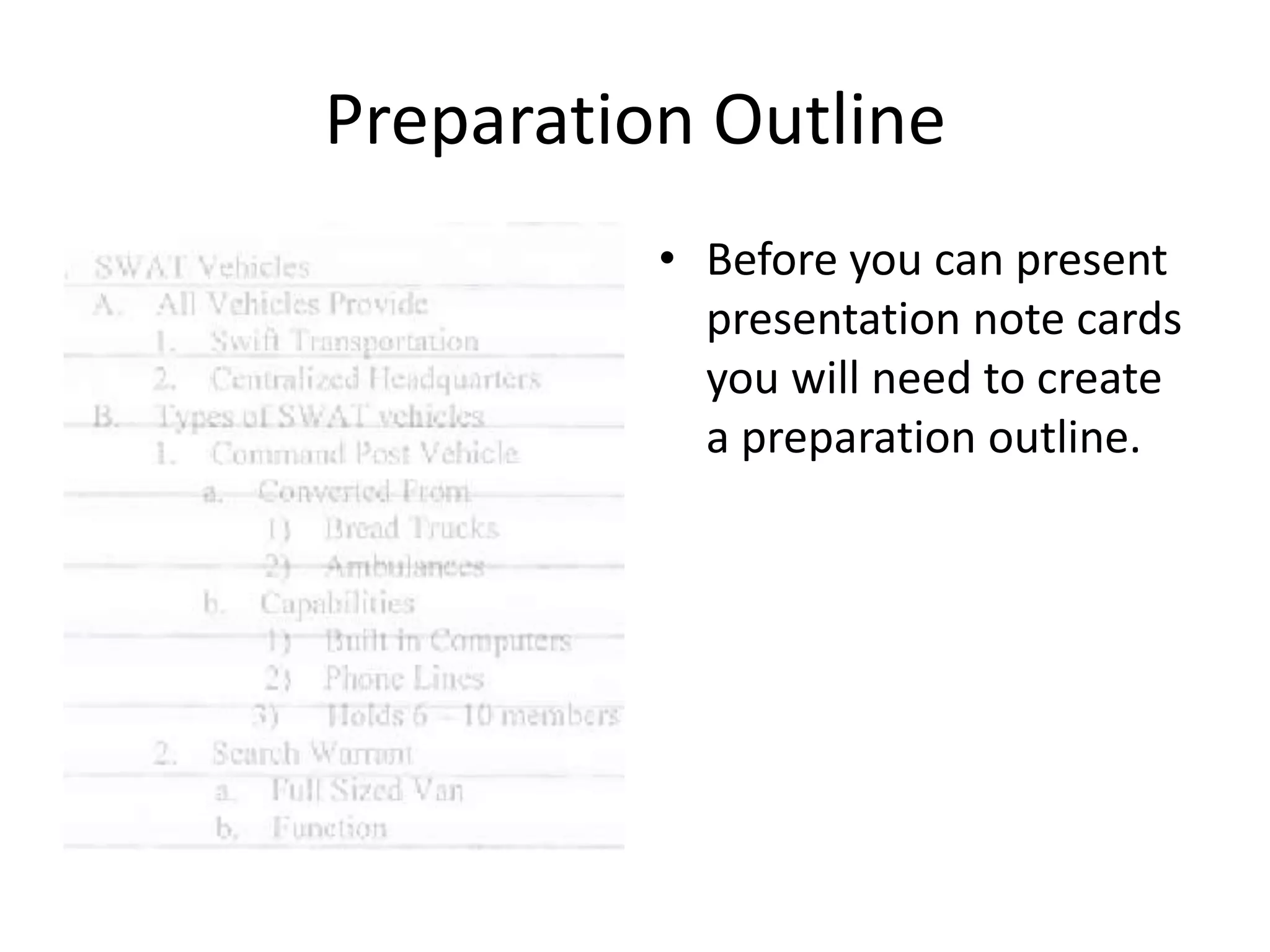 - Note cards are recommended as they are easy to handle. Notes should use large letters, have white space, and only be written on one side of each card.