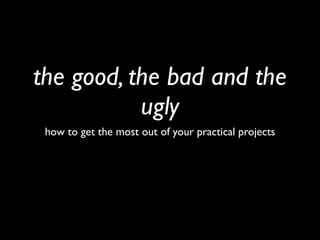 This document provides advice for students on how to get the most out of practical projects. It outlines 9 key areas of focus: research, planning, evidence, ideas, feedback, logistics, equipment, production, and reflection. For each area, it provides bulleted tips, such as conducting thorough research from multiple angles, planning for all possible issues, gathering evidence of creative processes, keeping ideas simple, soliciting feedback at all stages of a project from peers and teachers, and reflecting on work ongoing and at completion. The overall message is to be diligent in preparation, documentation of creative work, and self-evaluation.