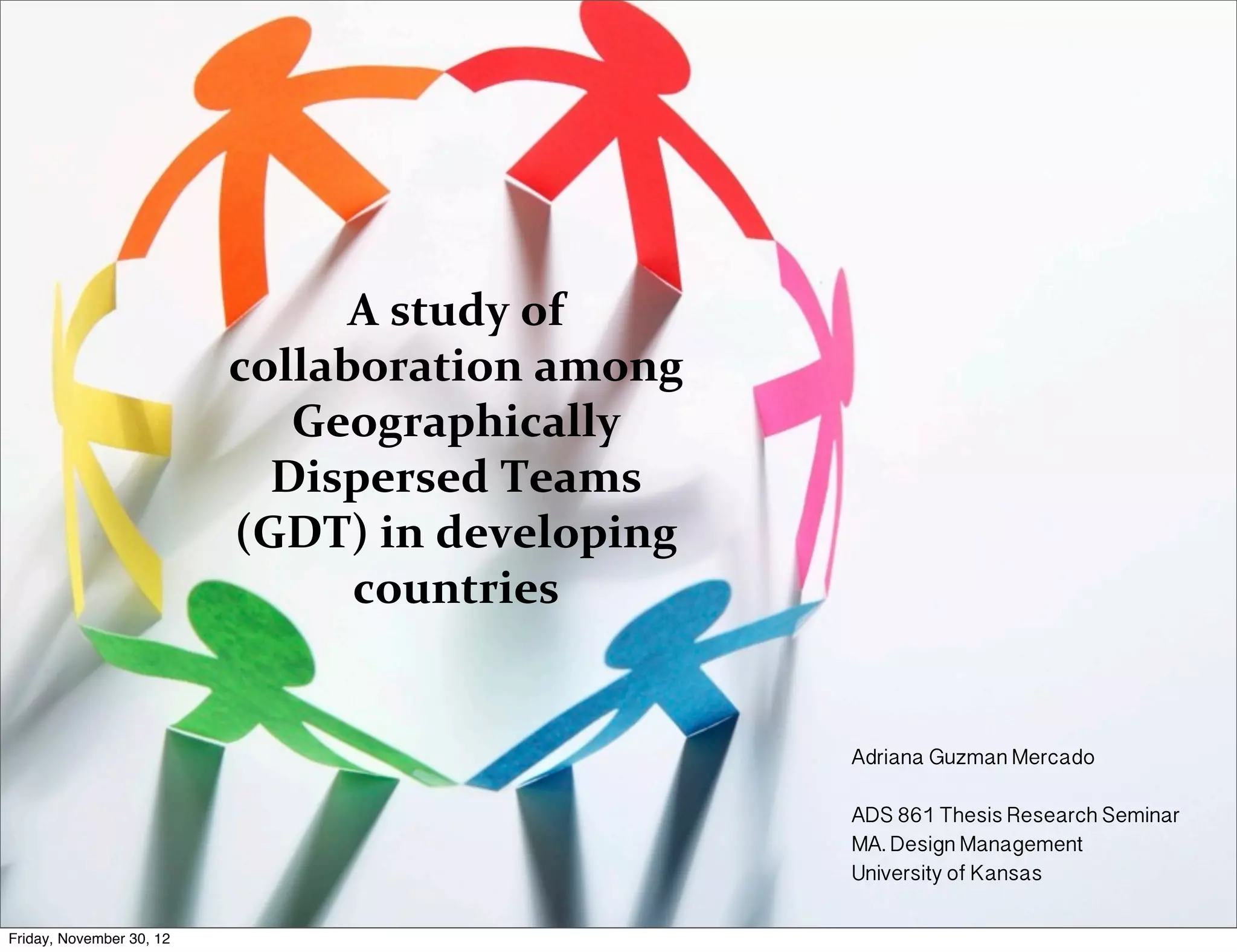 This document summarizes a study on collaboration among geographically dispersed teams (GDT) in developing countries. The study aims to improve the quality and effectiveness of collaboration for people and organizations in developing regions with limited technology access. Initial interviews found that language barriers, technology problems, lack of training, and expensive collaboration tools challenge GDT collaboration. The researcher plans to further evaluate software, conduct cultural probes and interviews, test prototypes, and read more literature to address how design strategies and models can enable better virtual collaboration among distributed teams in developing areas.