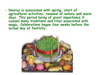 Novruz is an Azerbaijani spring holiday celebrated on March 21st that is associated with renewal and nature. In the weeks leading up to Novruz, there are four Wednesdays each dedicated to an element where rituals are performed to revive that element. Traditions on the holiday include preparing a sacred food called Samani, setting a copper tray with seven symbolic items for 12 days, unmarried women throwing coins in water for fortune telling, and families telling fortunes from a book. People celebrate by washing in water, eating sweets, smelling fragrant smoke, and children visiting others with gifts.