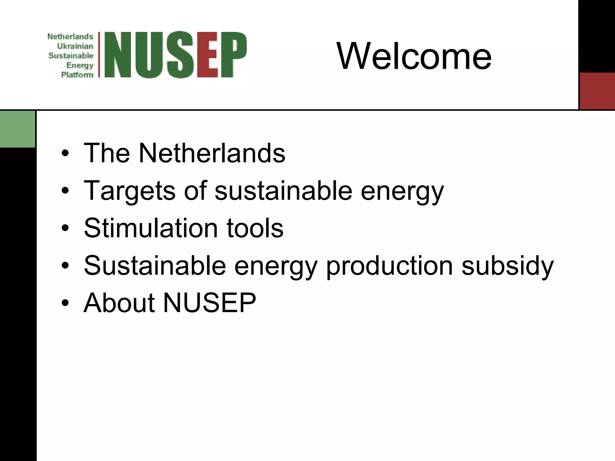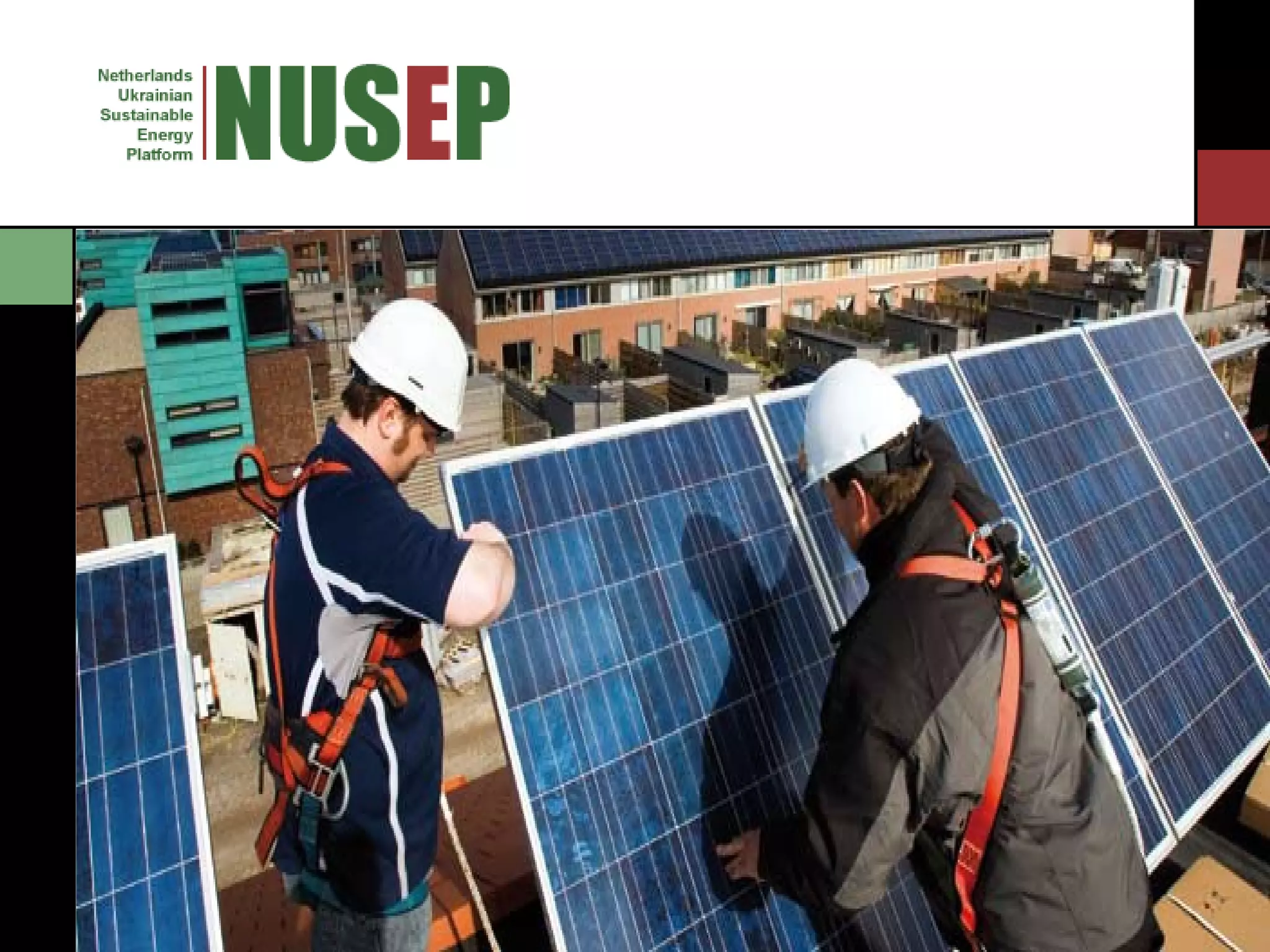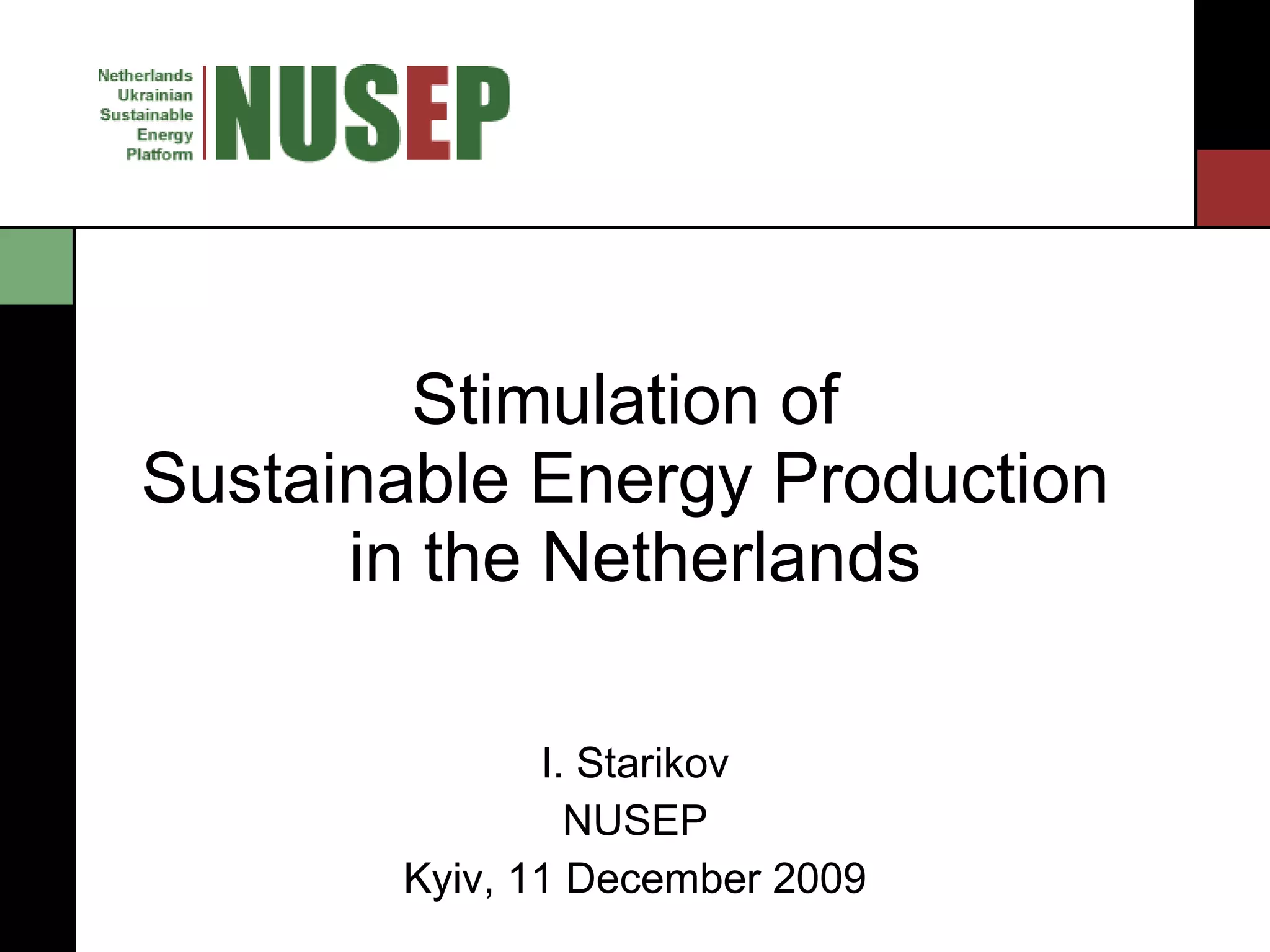 The Netherlands has ambitious targets for sustainable energy production by 2020, including 30% reduction in CO2 emissions and 20% of total energy generation from sustainable sources. To stimulate sustainable energy, the government offers subsidies through the SDE program for various renewable technologies like solar PV, wind, biomass, and hydropower. The SDE provides long-term compensation to cover above-market costs of sustainable energy production for up to 15 years. NUSEP is a non-profit organization that supports collaboration between Dutch and Ukrainian companies on projects focused on energy efficiency and sustainability.