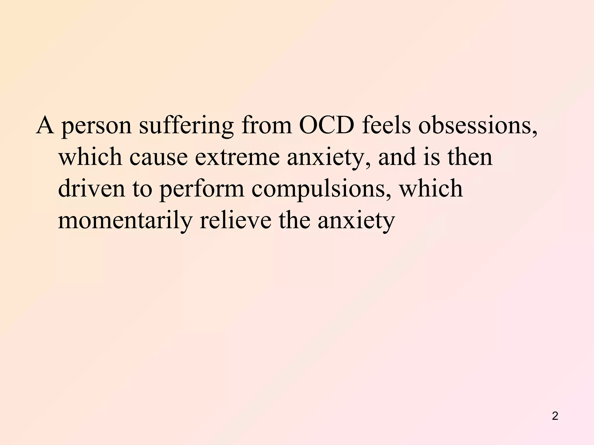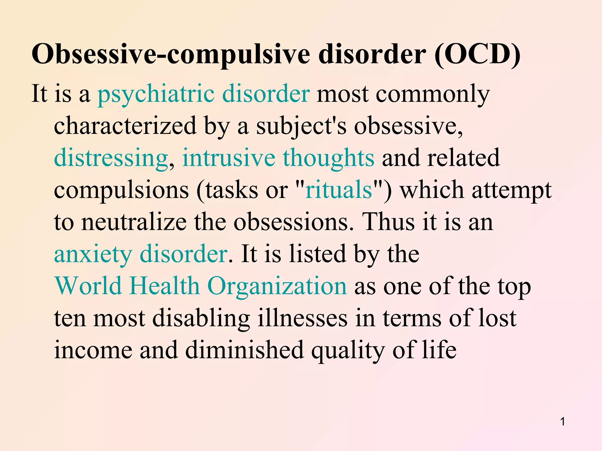 Obsessive-compulsive disorder (OCD) is characterized by distressing, intrusive thoughts and related compulsions that attempt to neutralize obsessions. Common obsessions include fears of contamination, harming others, mistakes, and social acceptance. Common compulsions include cleaning, checking, arranging, collecting, counting, and tapping. Cognitive behavioral therapy (CBT), specifically exposure and response prevention (ERP), is an effective treatment that aims to change maladaptive thoughts and behaviors by exposing patients to their fears while preventing compulsions.