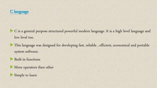 C is a general purpose, powerful, and structured programming language that is both high-level and low-level. It was designed for developing fast, reliable, efficient, economical, and portable system software. C has built-in functions, more operators than other languages, and is simple to learn. An algorithm is a sequence of instructions to obtain a desired result in a specified order, such as a program to calculate the sum of two numbers. A compiler converts all source code into machine code to create an executable file, while an interpreter converts and executes code line-by-line. The C character set includes letters, digits, special characters, and whitespace that make up commands, expressions, and other language tokens.