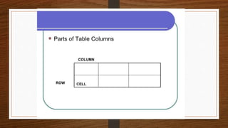 This document discusses different methods for presenting data, including textual, tabular, and graphical presentation. Tabular presentation organizes data into rows and columns in a table. Textual presentation uses statements and numbers to describe data. Graphical presentation shows variations and relationships of data using visual formats like bar graphs, line graphs, and pie charts. Each method has advantages - tables provide concise information while graphs attract attention and enable quick comprehension of quantitative data relationships.