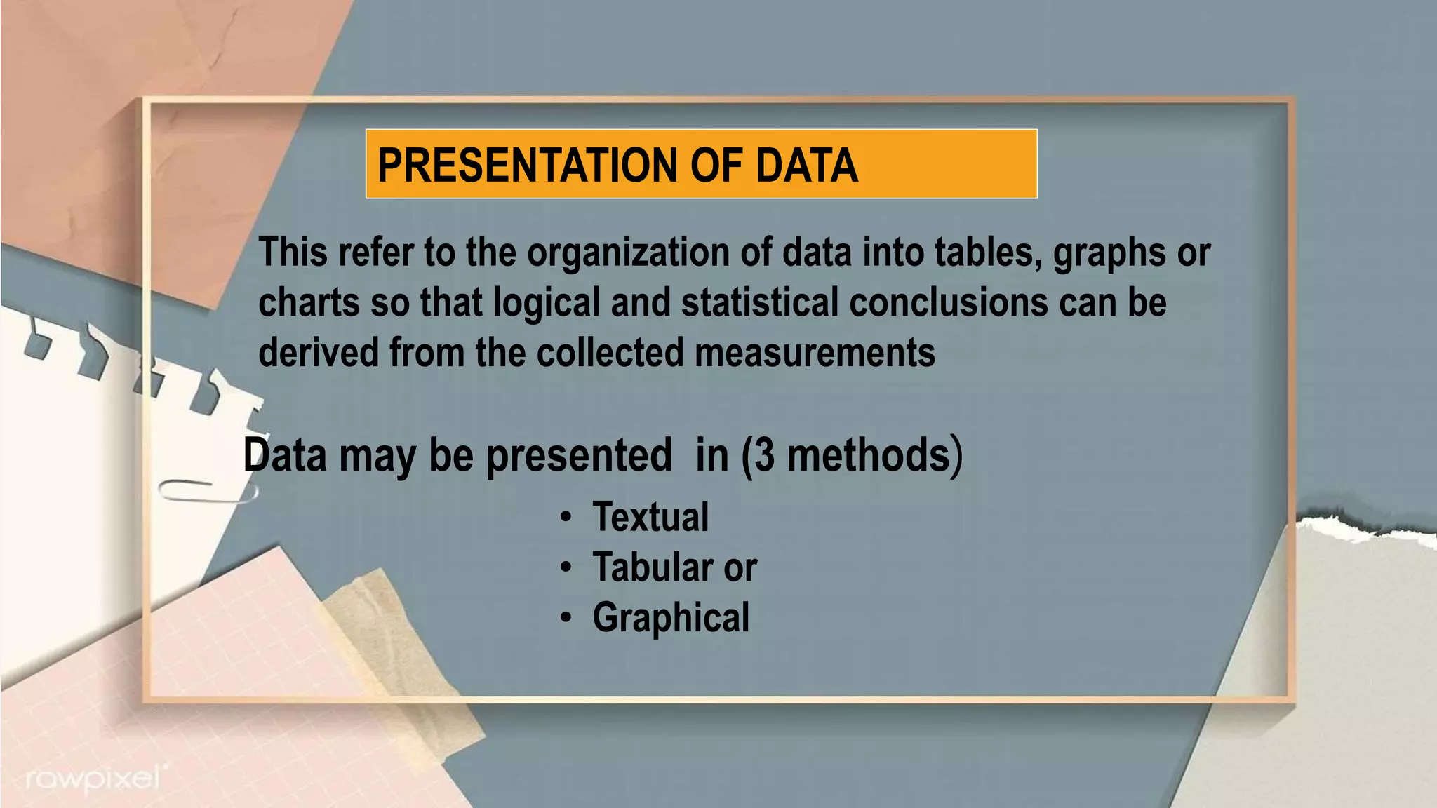The document discusses methods of data presentation, categorizing them into textual, tabular, and graphical formats. Textual presentation uses words and sentences, tabular presentation organizes data in rows and columns, and graphical presentation employs various visual formats like bar graphs, pie charts, and line graphs to convey information clearly. Each method is illustrated with examples, highlighting their utility in data analysis.