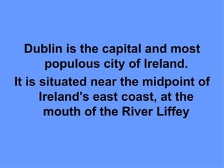 Dublin is the capital and largest city of Ireland, situated on the east coast at the mouth of the River Liffey. It was originally founded as a Viking settlement in the 9th century and grew to become the principal city under English rule. Major landmarks include Dublin Castle, Christ Church Cathedral, St. Patrick's Cathedral, and Trinity College, home to the ancient Book of Kells. Dublin prospered further during the Georgian era, resulting in iconic architecture like the Custom House and Temple Bar. Popular areas now include Grafton Street, Phoenix Park, and St. Stephen's Green. Dublin is known for Guinness, Irish whiskey, and legends like the lucky leprechaun.