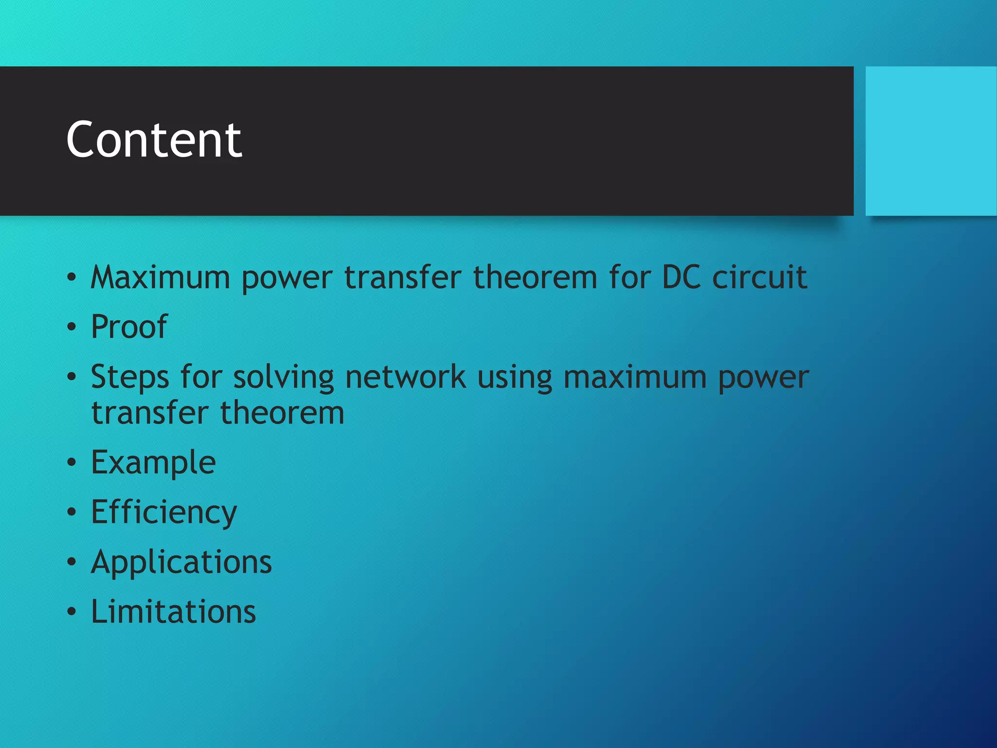 The Maximum Power Transfer Theorem states that maximum power is transferred to a load when the load resistance equals the Thevenin equivalent resistance of the circuit. The document outlines the theorem's proof, steps for application, efficiency calculations, and real-world applications such as in audio systems and automobile engines, while also noting its limitations in efficiency, typically capping at 50%. It emphasizes that the theorem is not suitable for applications where higher efficiency is critical.