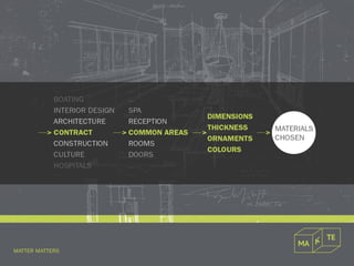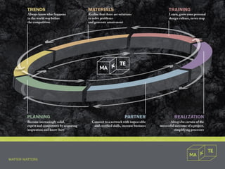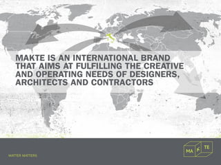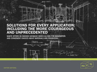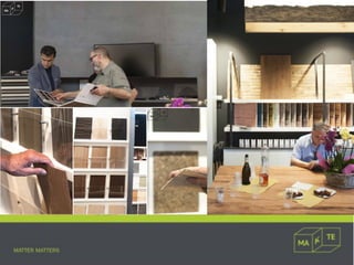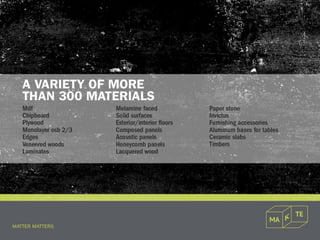 The document provides information on various wood materials and products available from Makte, including glues, new surfaces, timbers, wood veneer, MDF panels, Mepan poplar panels, chipboard, plywood, and oriented strand board. Details are given on the composition, properties, and applications of each material.