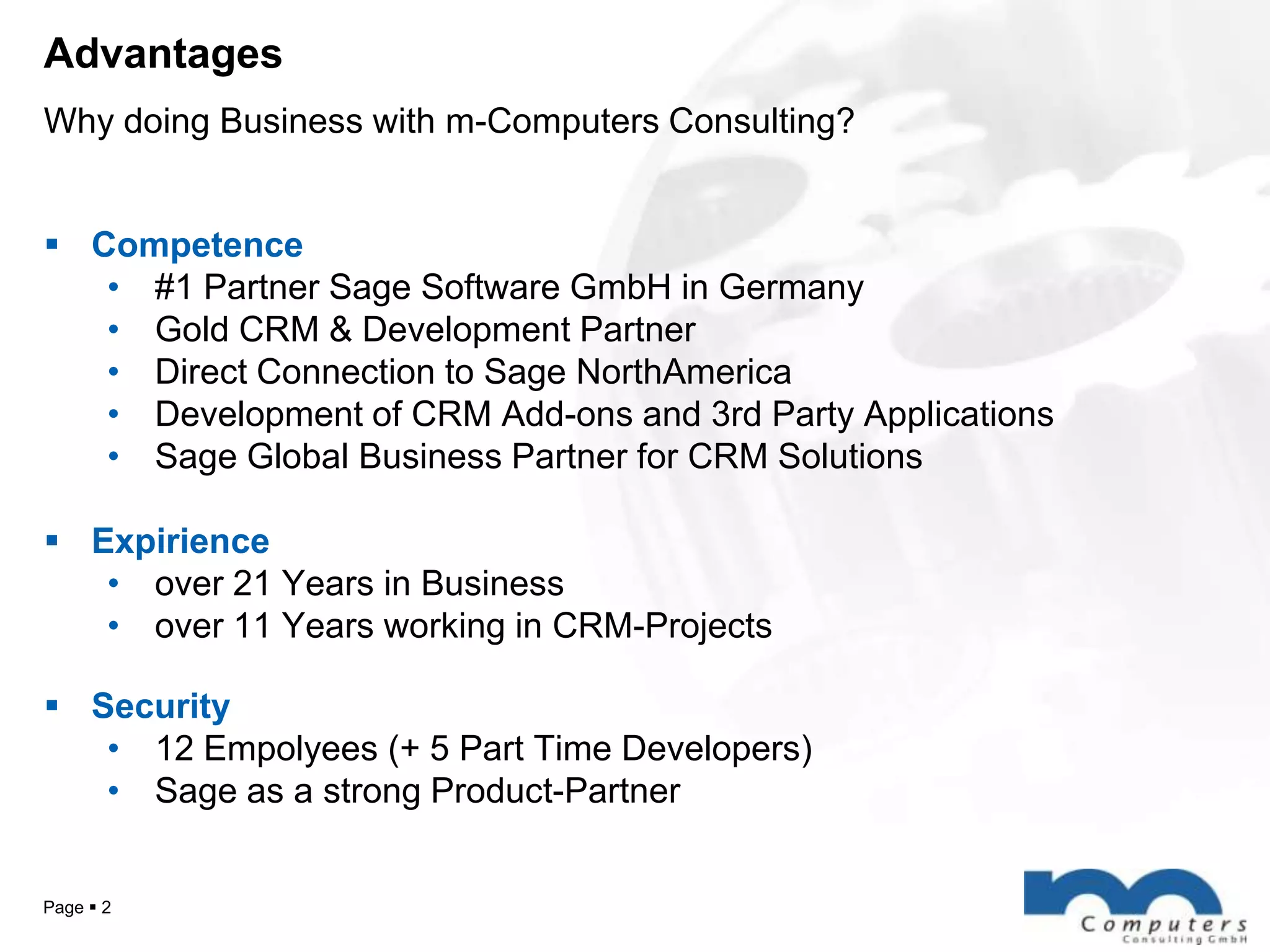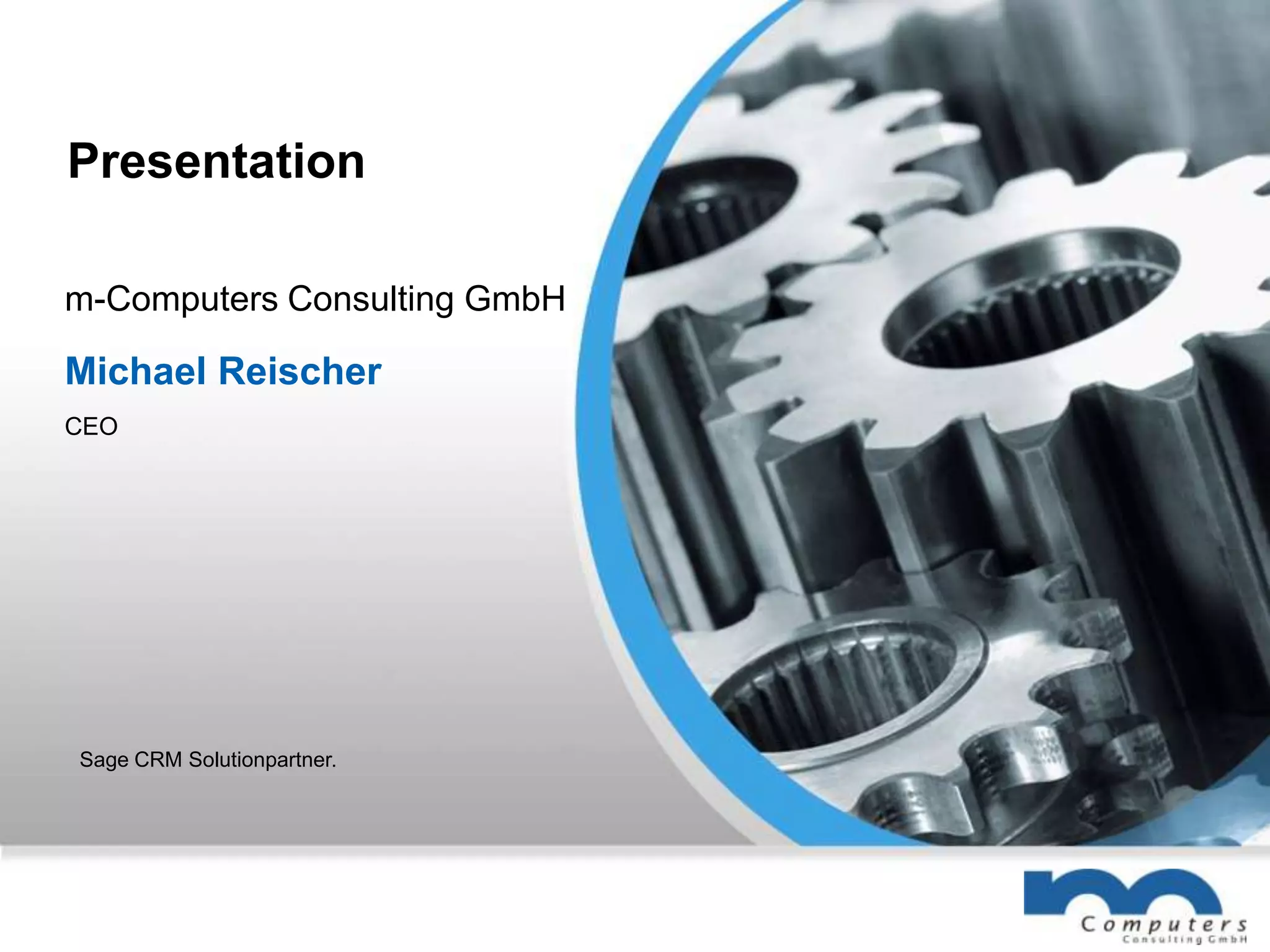 m-Computers Consulting GmbH is a Sage CRM Solution partner with over 21 years of business experience and 11 years working on CRM projects. It is the #1 Sage Software GmbH partner in Germany with a team of 12 employees and 5 part-time developers. The company follows a holistic strategic approach to CRM system implementation that integrates all customer-related processes across departments. Michael Reischer founded m-Computers in 1989 and established the consulting division in 2001, focusing on communication solutions and a partnership with Sage Software since 2007.